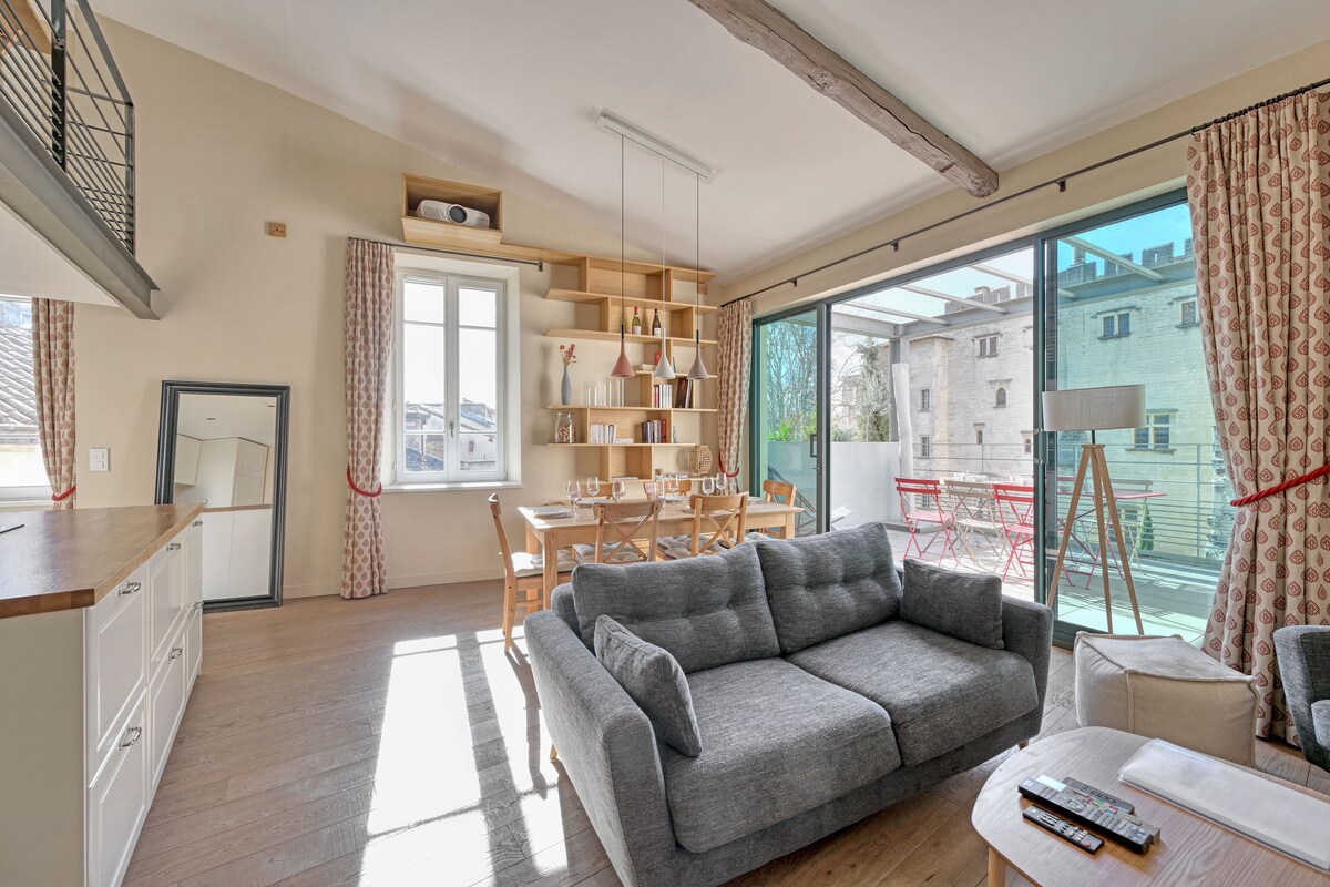 Stan na spratu sa 1 spavaćom sobom, sada sa klimatizacijom (novom od maja 2023. godine), u istorijskom centru Avinjona, sa mešavinom savremenih i tipičnih provansalskih detalja. Nalazi se u pešačkoj ulici na samo 5 minuta hoda od Papine palate. Ispred zgrade nema parkinga. Javni parkinzi su u neposrednoj blizini. Stan se nalazi na 4. spratu bez lifta, sa kog se pruža zadivljujući pogled na Papinu palatu i krovove. Vrlo mirno.