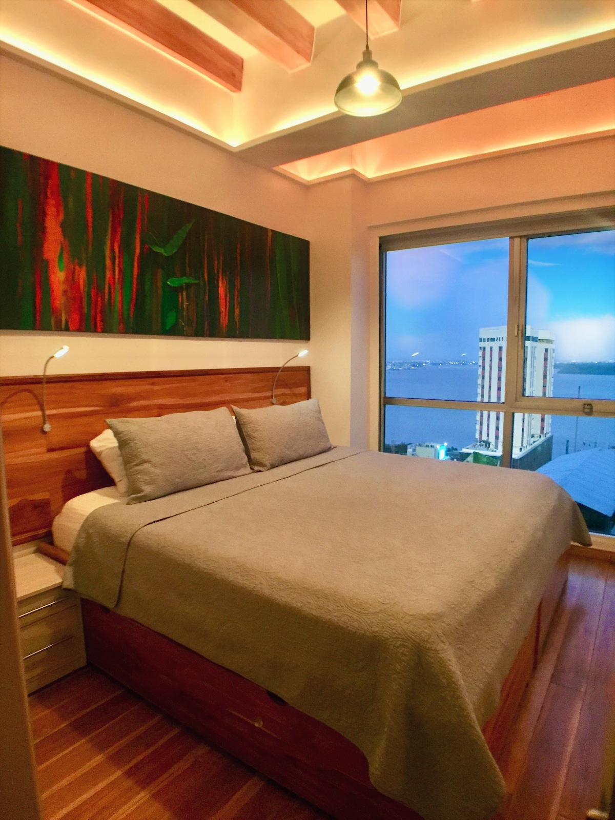 Kompletno renoviran, minimalistički dekor, podovi od tikovine od tvrdog drveta, neverovatan pogled na grad i reku, potpuno opremljena kuhinja, klima-uređaj, zavese za zamračenje u sobi kada je to potrebno, kišni tuš, topla voda, perilica, sušilica, vifi, TV ravnog ekrana, netflik, prečišćena filtrirana voda za piće, 24-satno obezbeđenje zgrade, najbolja lokacija u gradu, na pješačkoj udaljenosti od gradskih atrakcija. Tri bloka oko mnogih restorana, barova, prodavnica, super marketa, parkova i trgova.