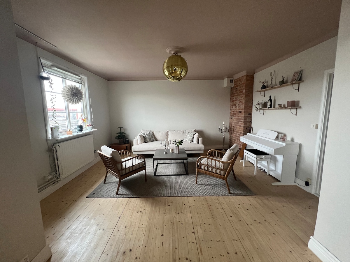 Originalni i svetli skandinavski stan na najvišem spratu zgrade sa zadivljujućim pogledom na kulturno naslijeđe Geteborga i pogled na daleki grad. Nalazi se u blizini Liseberga i centra grada u mirnom delu grada u krugu od 5 minuta hoda do tramvajske i autobuske stanice. Možete uživati u potpuno opremljenoj kuhinji, stolu za večeru, mekanom i udobnom bračnom krevetu i udobnoj dnevnoj sobi.