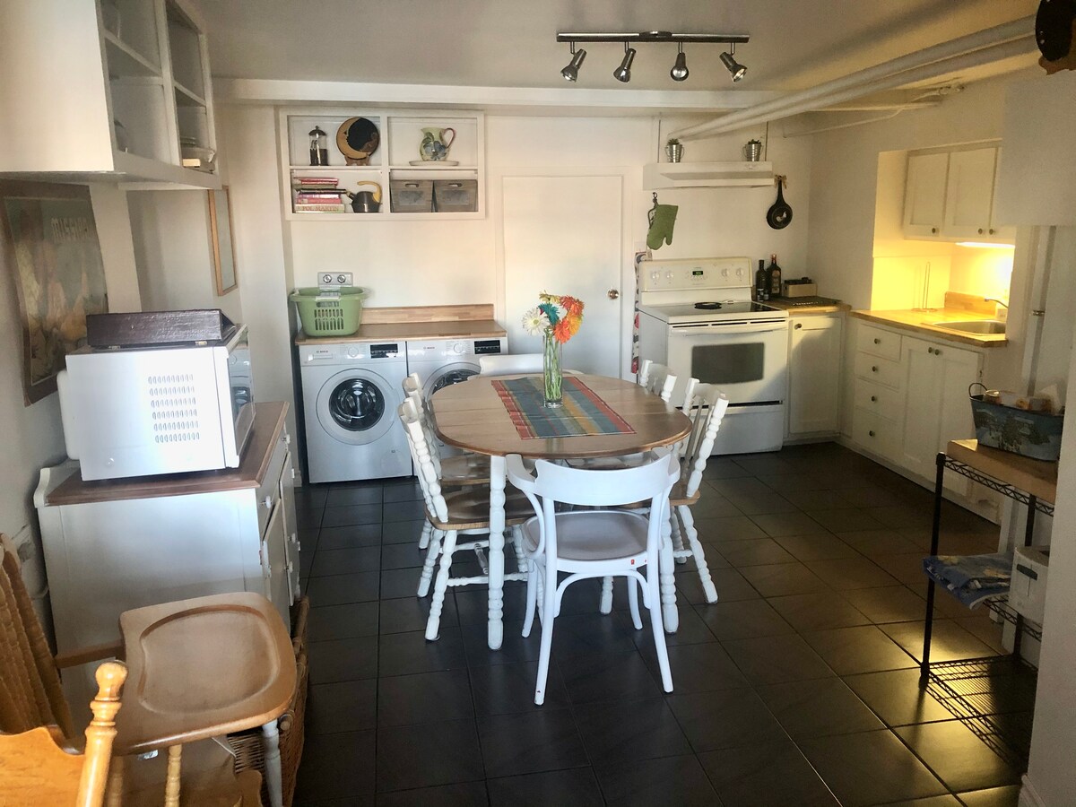 Vrlo veliki stan od 1300 kvadratnih stopa, svijetao u podrumu. Prozori na visini ramena (polu-podrum). Dobro opremljena kuhinja, dnevni boravak sa kaminom za atmosferu. 2 spavaće sobe, glavna spavaća soba sa bračnim krevetom i bračni krevet u drugoj. Bračni krevet (širine 150-179 cm) u dodatnoj trpezariji. Mašina za pranje/sušenje veša i keramička tuš-kada. Besplatan parking uz kuću će biti rezervisan za vas. Mirno područje na 10 minuta od Starog Kvebeka. Autobuske linije u blizini. CITQ br.: 302470