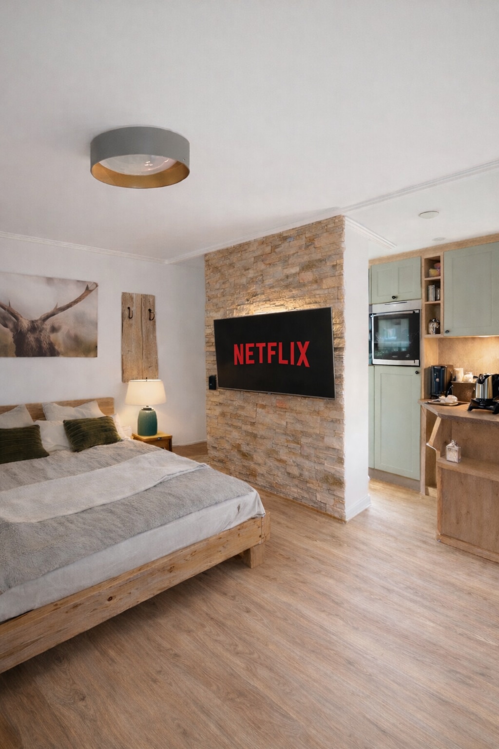 Unser modernes und stilvoll eingerichtetes Apartment verfügt über alles, was du für einen angenehmen Aufenthalt benötigst: • Großzügiger Balkon • Ein Kingsize Bett (180x200) • Smart TV mit Kabel TV • NESPRESSO Kaffeemaschine und Teebar • Voll ausgestattete Küche • Essbereich • Schwimmbad,Sauna (kostenpflchtig 1 €), Solarium und Kinderspielzimmer • Tiefgaragenstellplatz und SB Waschmaschine (kostenpflichtig) • Bettwäsche, Handtücher,Shampoo und Duschgel inkl.