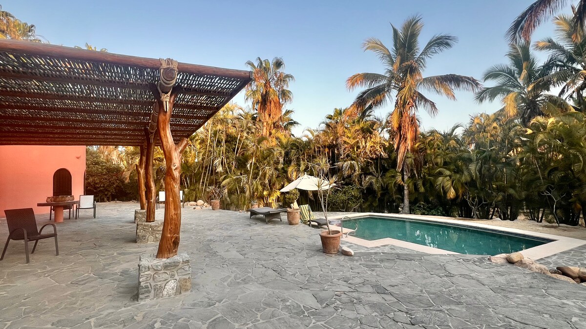 Casa Naranja Casitas offers a 2 bedroom, kitchen, living space & bath casita plus an adjacent 1 bedroom studio casita located on a 1.5-acre estate in a tranquil oasis in the heart of Todos Santos, Mexico. You'll love the secluded grounds, full sized pool, lush greenery & towering palms. These hacienda-style bungalows blend traditional Mexican charm with modern amenities. The gated estate feels isolated, yet is only 1/2 km walk to beach, restaurants, yoga & more. Tennis and pickleball close by!