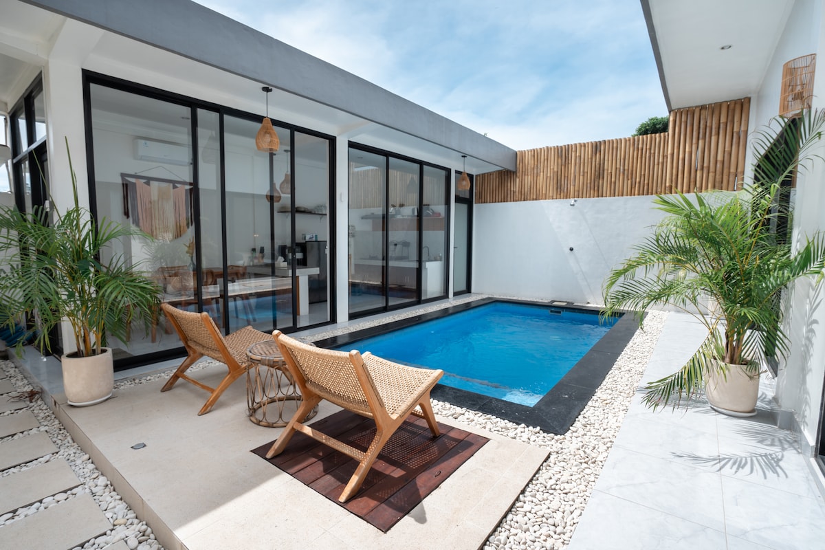 Step inside to discover a bright open-plan living area with modern décor and Balinese touches. Each of the three spacious bedrooms comes with its own private bathroom, ensuring privacy and relaxation for every guest. The private swimming pool sits at the front of the villa, inviting you to unwind under the sun or enjoy an evening dip after exploring the island.