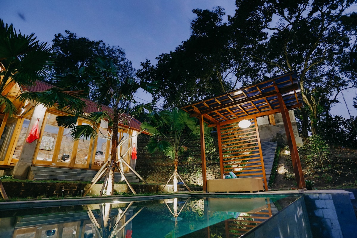 Odsjednite u jednom od naša dva ekskluzivna bungalova na vrhu bujne predivne osamljene doline pored mora. Uživajte u besplatnom punom doručku s pogledom koji oduzima dah svakog jutra. Čvrsto spavajte u prirodno hladnom bungalovu s luksuznim kupatilom na otvorenom i trijemom s pogledom na prirodu. Uživajte u savršenom vremenu na Baliju dok večerate (ili kuvate) u otvorenom rustikalnom prostoru sa prohladnim salonom na spratu, sa pogledom na predivan pogled na bazen. Divite se zadivljujućim pogledima od doline do vulkana i okeana.