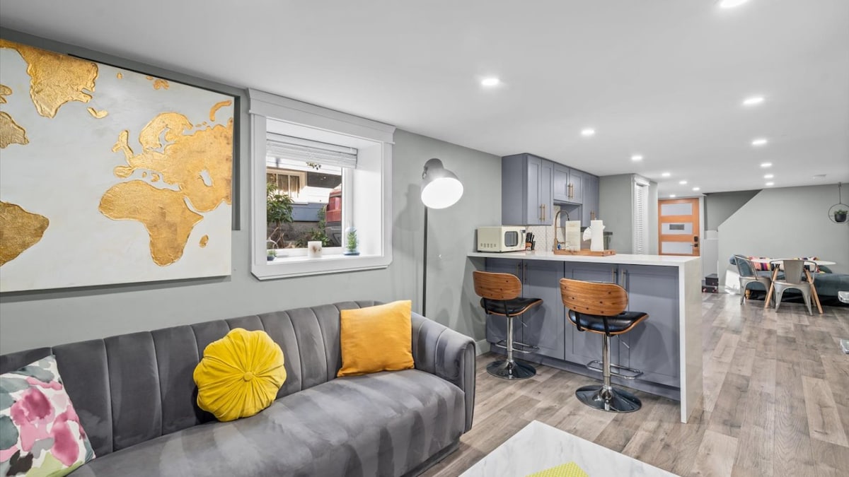 World Cup fans welcome--a public transit stop just feet away gets you to matches and the fan zone in just 40 minutes. This whimsical beachcomber's dream with accessibility features is conveniently located in Seattle. Imagine counting waves, not sheep, as you’re lulled into a restful sleep in this cozy, modern nautical paradise. The comfy refuge is close to UW, hospitals and Seattle attractions, and you can work or relax next to a relaxing garden with a flagstone patio set on a quiet alley.