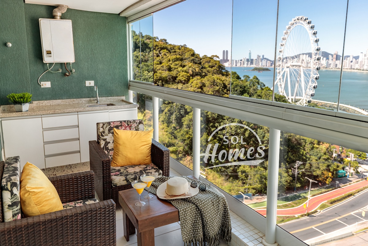 O local é maravilhoso e conta com uma vista de tirar o fôlego de toda a orla de Balneário Camboriú. Já da sala e do quarto do casal é possível ver com nitidez toda a orla do norte ao sul da praia. Ainda ficamos na frente de um dos pontos turísticos mais visitados e procurados de Balneário que é a Roda Gigante, que inclusive serve a noite como um abajur para o apartamento.