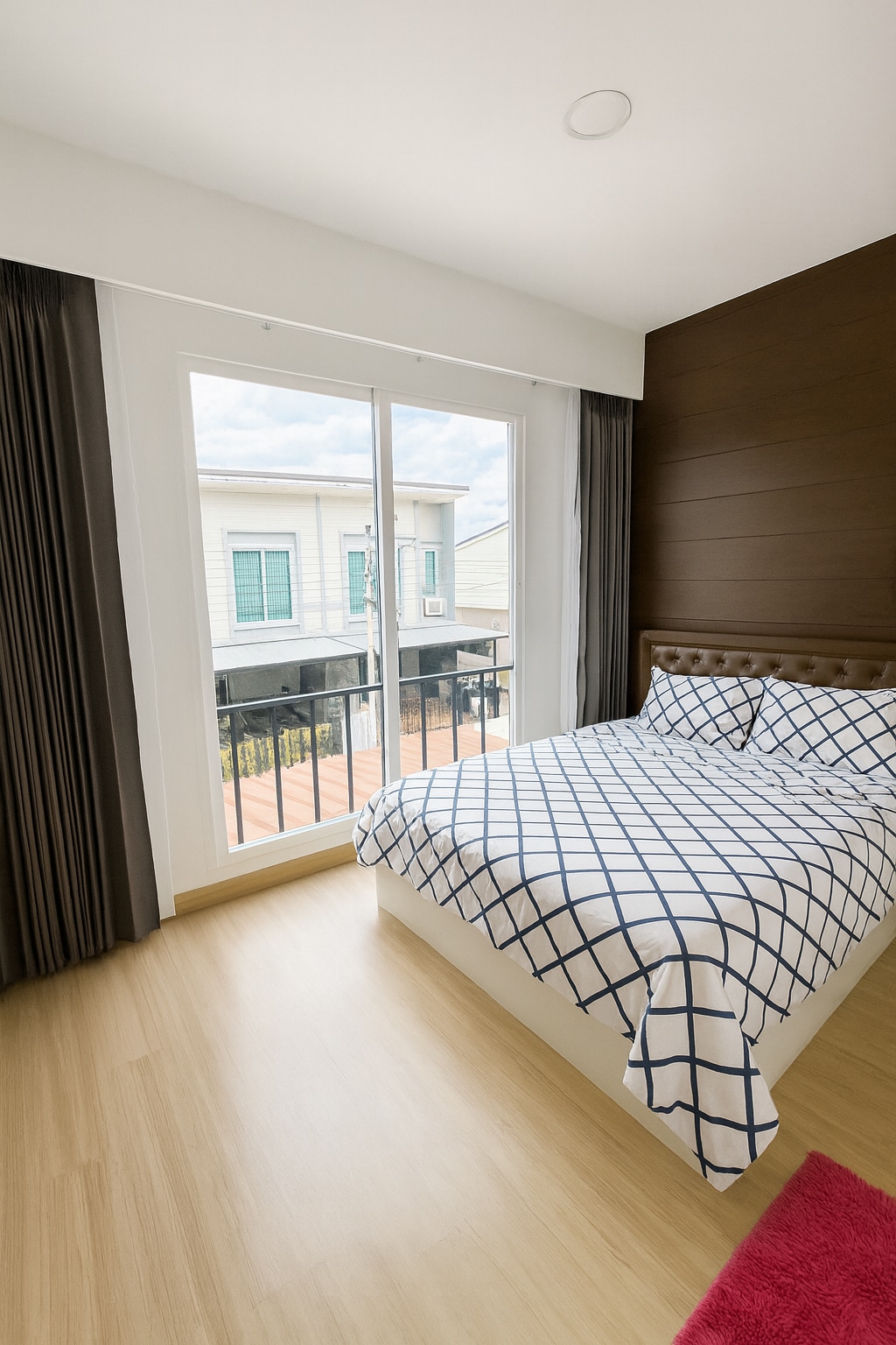 The accommodation is located in a housing estate near Mega Bangna. The neighborhood is peaceful and quiet, with shared facilities including a fitness center, swimming pool, and a public park. It’s about a 10–15 minute walk to the nearest 7-Eleven, and food or other essentials can be conveniently delivered right to the doorstep.