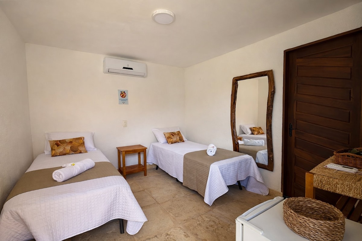 Suíte aconchegante e bem decorada, perfeita para casais que buscam conforto e charme em um ambiente intimista. Decoração rústica com toque contemporâneo, piso em pedra natural e detalhes artesanais que remetem à cultura local. Tudo que você precisa para relaxar e curtir a Vila Riomar com privacidade e estilo.