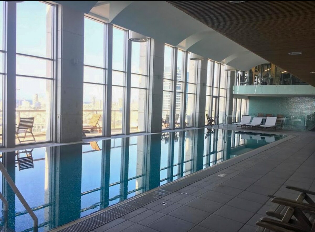 ♚ Welcome to our luxury 2-bedroom apartment ♚ on the 30st floor of Midtown Tower, Tel Aviv's iconic landmark. Enjoy of breathtaking city and sea views, mesmerizing sunsets that paint the skyline. Prime Location apt, 5 min walk from Azrieli Mall, Sharona Market, the Train Station and public transportation everywhere!, a 15 min walk from Rothschild Blvd. Enjoy free access to an equipped gym and pool and 24/7 security. One of our bedrooms is a secure room (Mamad) ☑ Make yourself at home ♡