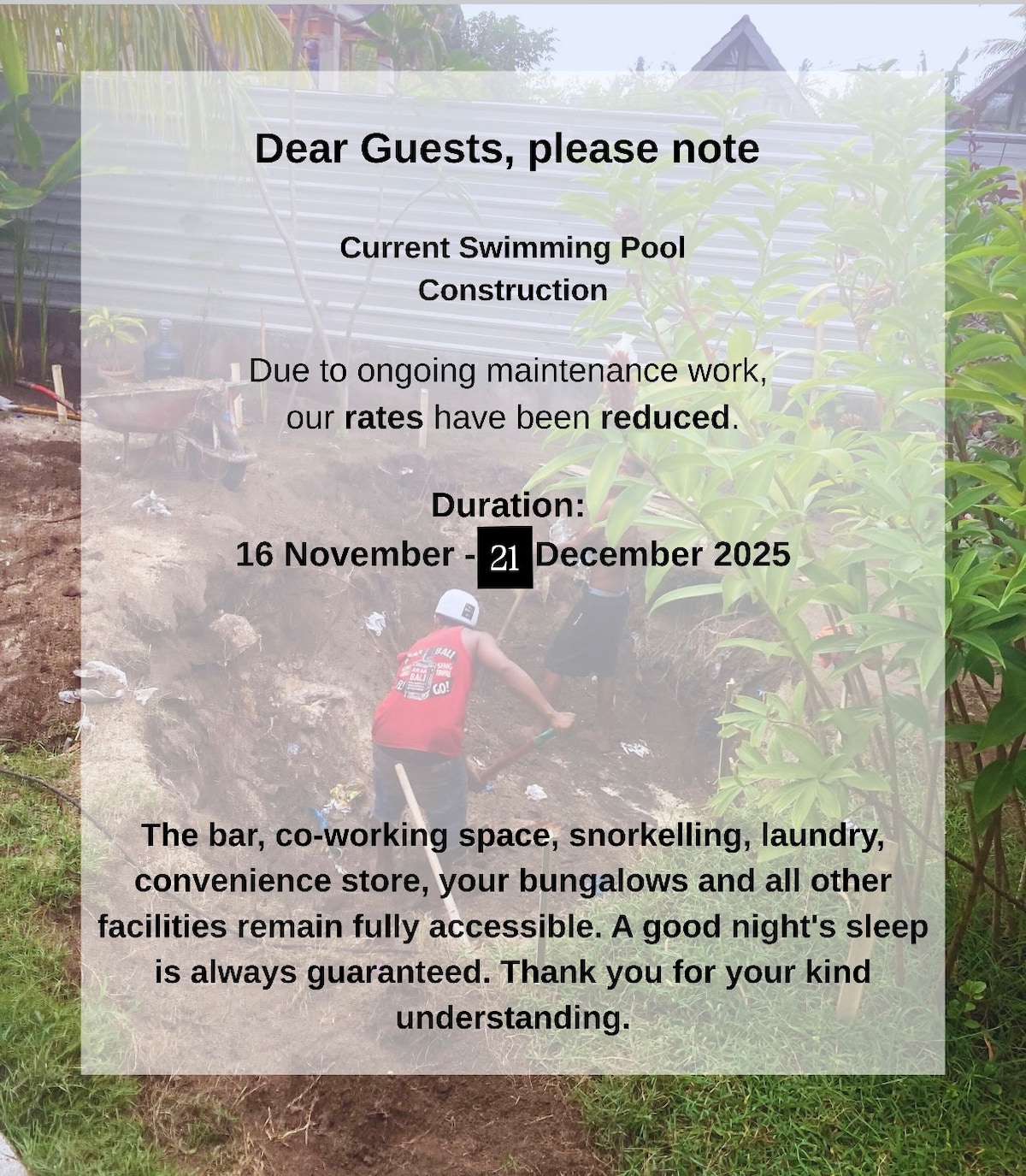 Naša vila je udaljena samo 100 koraka od prelepe plaže na kojoj možete da se prošetate, plivate ili sedite i čekate da sunce zalazi iznad Balija. Udaljeni smo samo 7 minuta od turističkog centra Senggigi u kojem se nalaze restorani i barovi udaljeni su samo 10 minuta od luke do ostrva Gili. Naša soba je velika i klimatizovana. Možete uživati u doručku pored našeg bazena. U svakom trenutku vam je na raspolaganju aparat za vodu sa čajem/instant kafom. Prevoz je dostupan 24 sata.