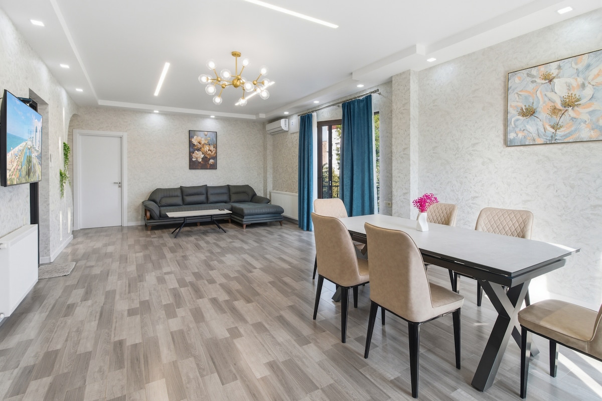 Prostran i svetao stan od 120 m² na trećem spratu privatne kuće sa privatnim ulazom. Stan ima 2 velike spavaće sobe, dnevnu sobu, kuhinju, kupatilo i balkone. Svaka soba ima klima-uređaj, balkon i centralno grejanje. Kuhinja je potpuno opremljena, uključujući mašinu za sudove. Gosti imaju pristup terasi, bazenu, zelenom dvorištu i prostoru za roštilj. Stari Batumi je udaljen 10 minuta hoda.