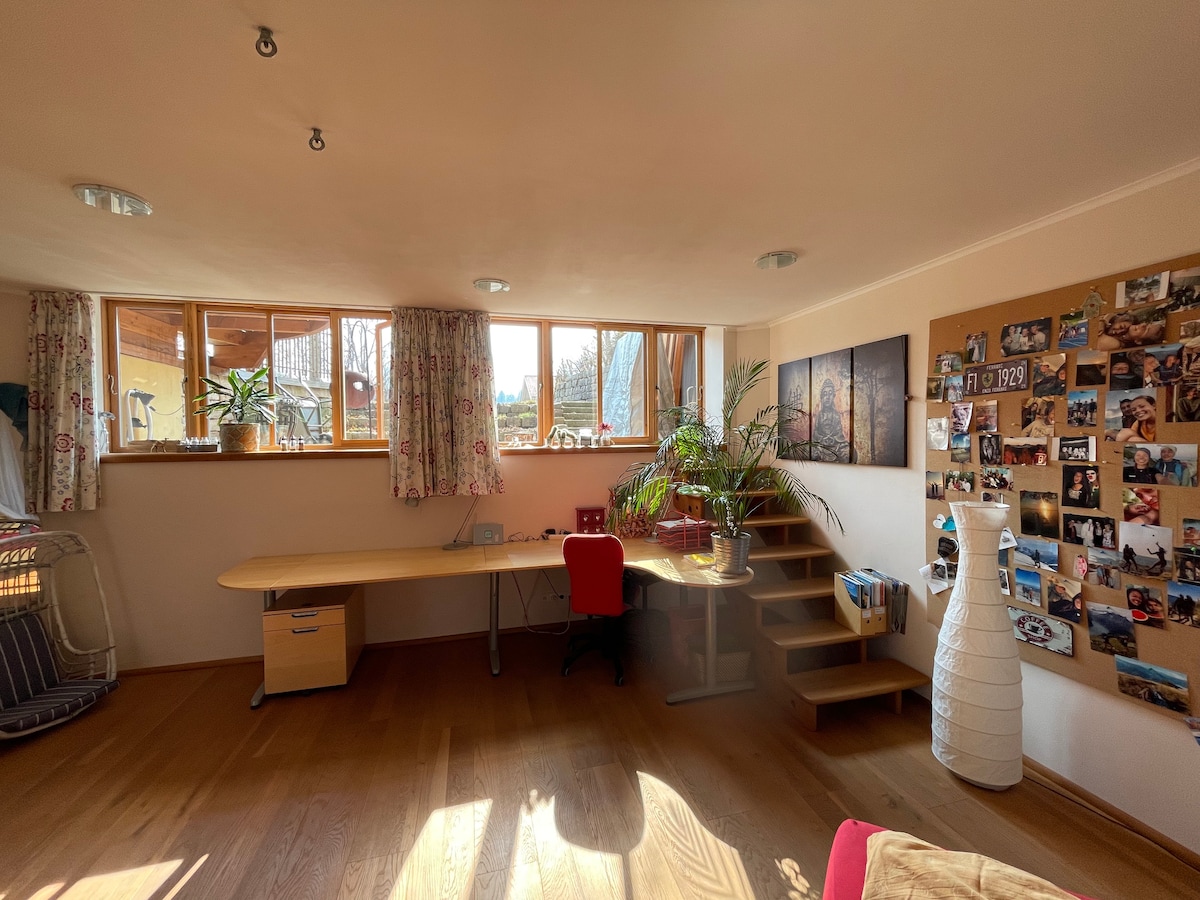 Stan sa dnevnim i spavaćim prostorom (galerija za spavanje - strme stepenice pogledajte fotografiju i kauč u dnevnom boravku) sa kuhinjom, kupatilom/ toaletom na planinskoj farmi staroj 500 godina, mirna lokacija iz snova, visoko iznad Bad Rajhenala. Okrenut prema jugu, terasa, ogromna bašta. Prostorija za jogu, sauna. E-planinski bicikli. Važne informacije za goste iz Kine: imamo mačku u kući i velike aktivnosti kuvanja nijesu dozvoljene.