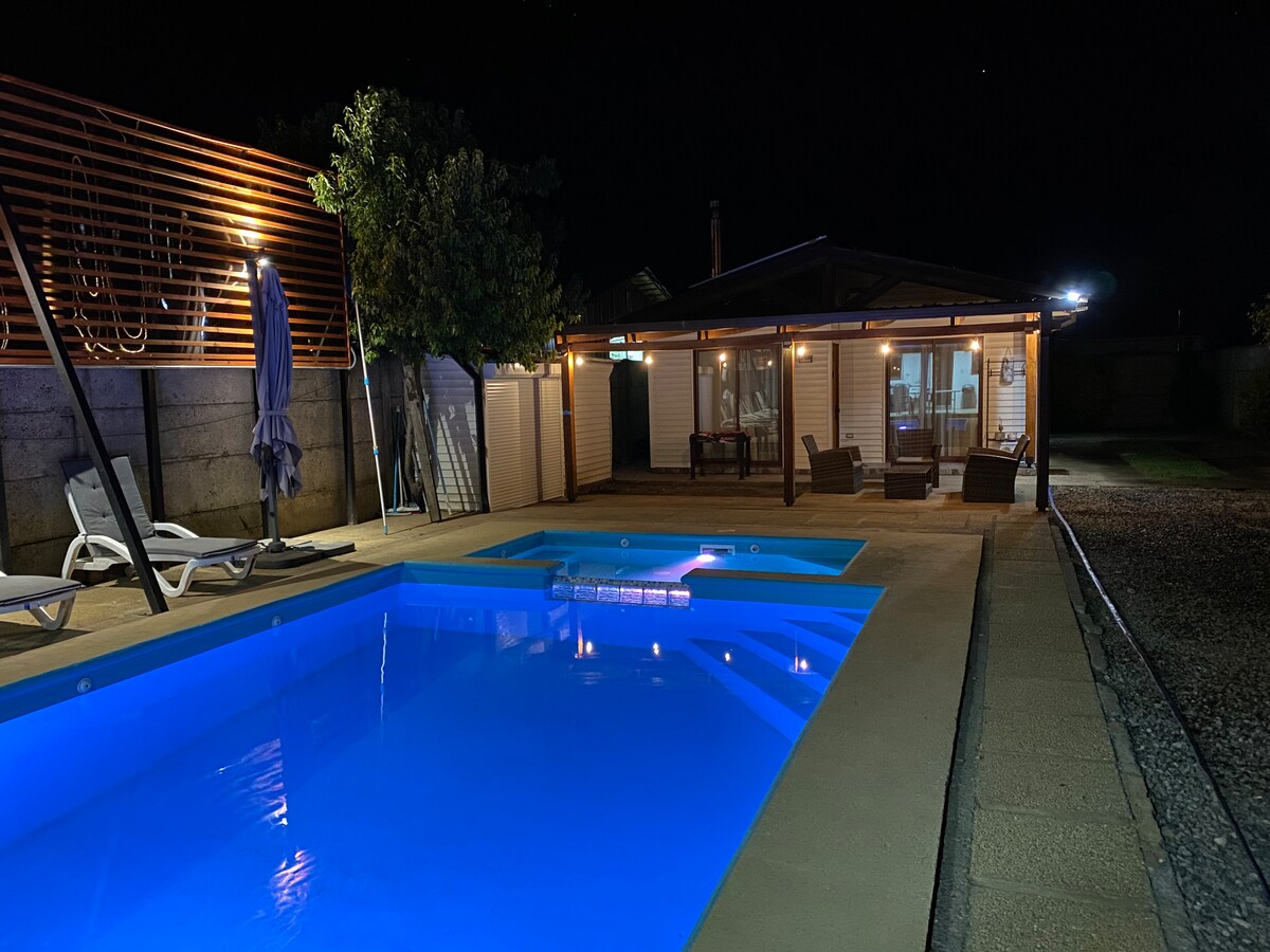 Samo brvnara uronjena u pola hektara (5.000 m2) privatne autohtone šume sa minisenderosom, BAZENOM (ljeto) i igrama ISKLJUČIVO za goste. WI-FI Fiber/ 2 PAMETNA televizora(HD c Pack DISNEY+/ESPN ITD.)/DirectTV/Pitka voda/Gas/Drva za ogrev/Peškiri/Čaršavi/Mašina za pranje veša Kapacitet p/ 4 osobe. 1D bračni krevet i 1D. sa 2 kreveta od 1 mjesta.; trpezarija-kuhinja (potpuno opremljena), šporet na drva, 1 kupatilo, roštilj sa roštiljem. U blizini centra Los Lleuques i 25 km od Nevados de Chillán