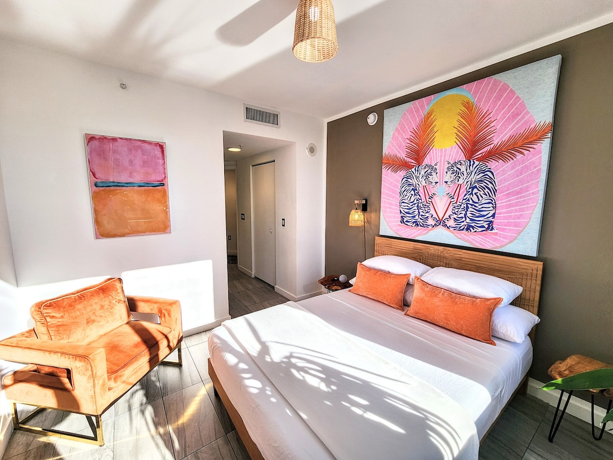 Penthouse Level Studio with DIRECT WATER VIEWS in Miami Design District, a room with a view, decorated with lots of love and inspired by the ocean. Residence has 12'' floor to ceiling windows and access to the resort style amenities, stunning pool with cabanas, gym (open 24 hrs.), modern lounge, BBQ area, electric car charging station and FREE ASSIGNED PARKING in the very heart of Miami. Maximum 3 guests. Walking distance to the best shopping, dining, museums and much more.