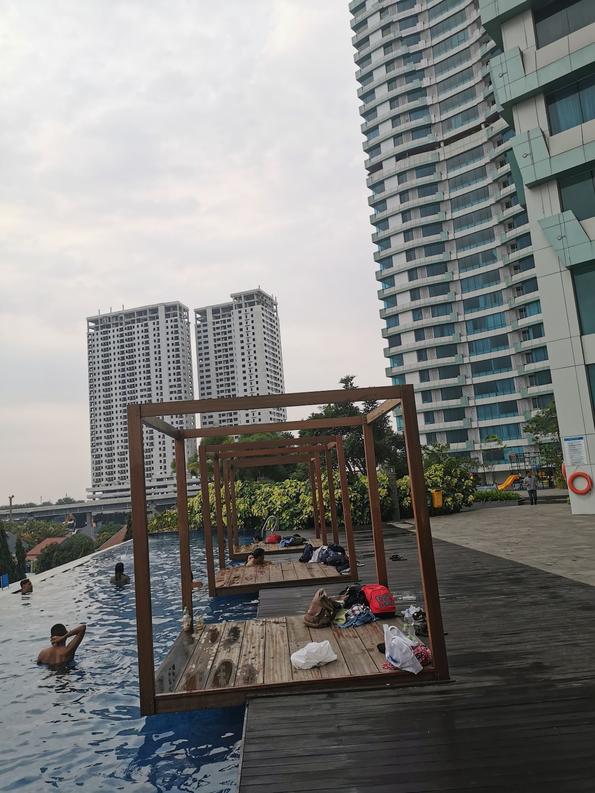 The apartment have 2 bed rooms, living room, kitchen, balcon and 1 private bathroom. Theres Air conditioner, Gas Stove, exhaust fan and refrigerator. Cozy sofa and Television with DVD player. Free to swimming pool and also available Canteen food and drinks near pool which can order by phone for Room Service. Laundry service ready in Upper Ground Floor with personal charge.