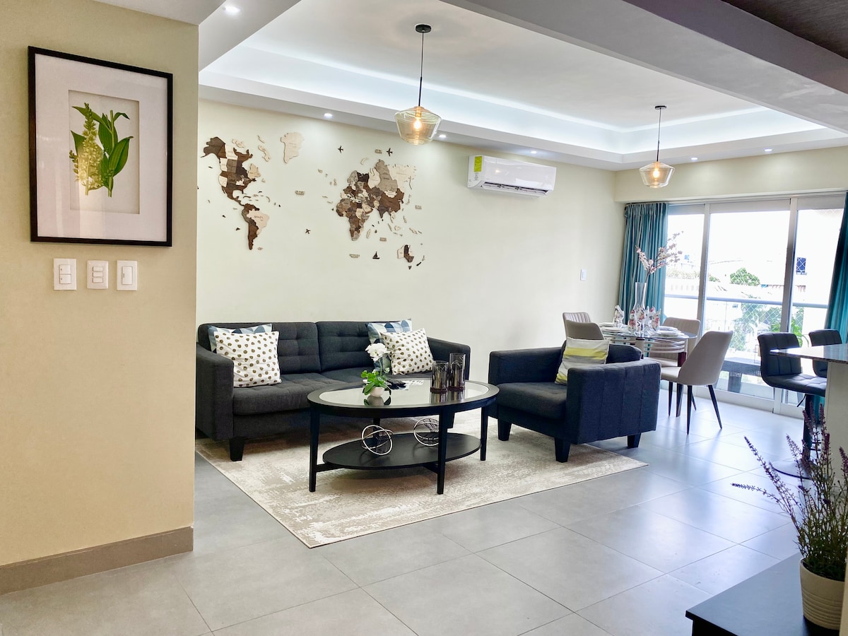 #CasaHJP New Lux and Modern Condo Apt. with Rooftop Pool, Gym, Social Area, and Child Play Space. Walking distance from Mall, supermarket, restaurants and bars. 40 Minute Uber drive from Las America's airport and 12 Minutes from Historic Colonial Zone. Condo is one block away from Avenida Sarasota, an avenue with a concentration of bars, restaurants and lounges (day parties). TV in living room with Netflix. Wifi, sound bar with Bluetooth. Building has 24 hr doorman.