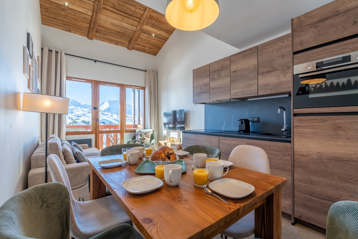 Vrlo lijep, udoban i dobro opremljen stan, koji se nalazi u podnožju padina i u srcu imanja Paradiski (435 km staze). Nalazi se na 7. spratu (lift), okrenut ka jugu, pogled je veličanstven. Škola skijanja se nalazi na dnu zgrade i moguće je pristupiti direktno spratu stana putem nagiba. Smještaj se nalazi na nadmorskoj visini od 2100 m, snijeg je uvijek dobar. Uključeni su parking, posteljina i peškiri, kao i čišćenje na kraju boravka.