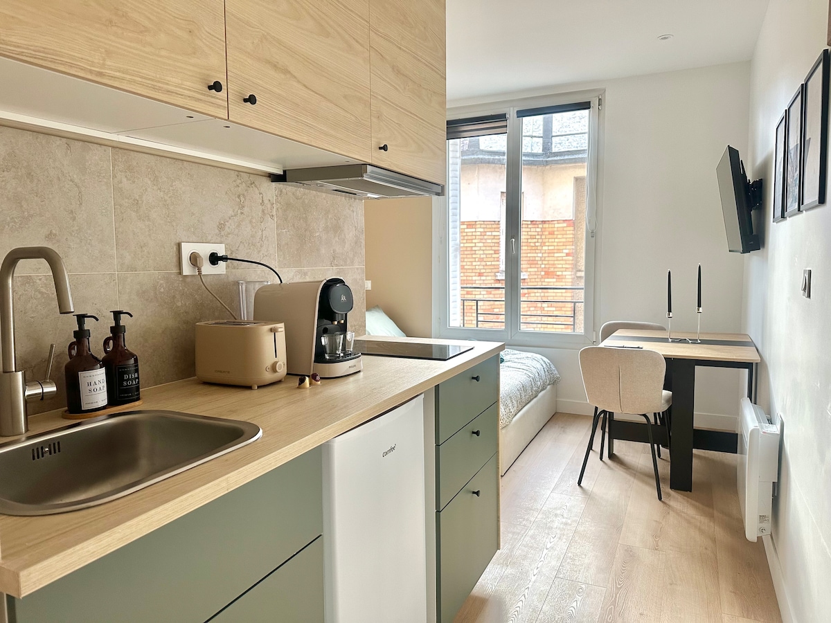 Šarmantan stan, idealno smješten u mirnoj ulici u srcu trendovske i tipične četvrti, popularan među Parižanima zbog brojnih barova i restorana. U blizini groblja Pčre Lachaise i ulice Oberkampf. Vrlo dobro povezan, 2 minuta hoda do metroa Ménilmontant. Prostran studio sa svijetlim karakterom, na gornjem spratu mirne zgrade, sa prijatnim dnevnim boravkom. Pogled na krovove Pariza i crkvu Notr Dam de la Croix de Ménilmontant.