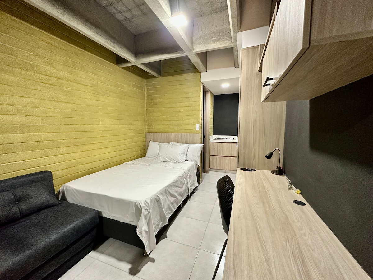 Lujosa suite ,ubicada al frente del aeropuerto y enseguida el centro comercial unicentro, amoblada con todo lo necesario para disfrutar tu estadía, Ac, parqueadero, cocina dotada, agua caliente, Wifi… Con espacio para coworking , con máquina dispensadora de bebidas y alimentos , máquina de café y bebidas calientes y una sala de muy buen espacio para tus reuniones de trabajo