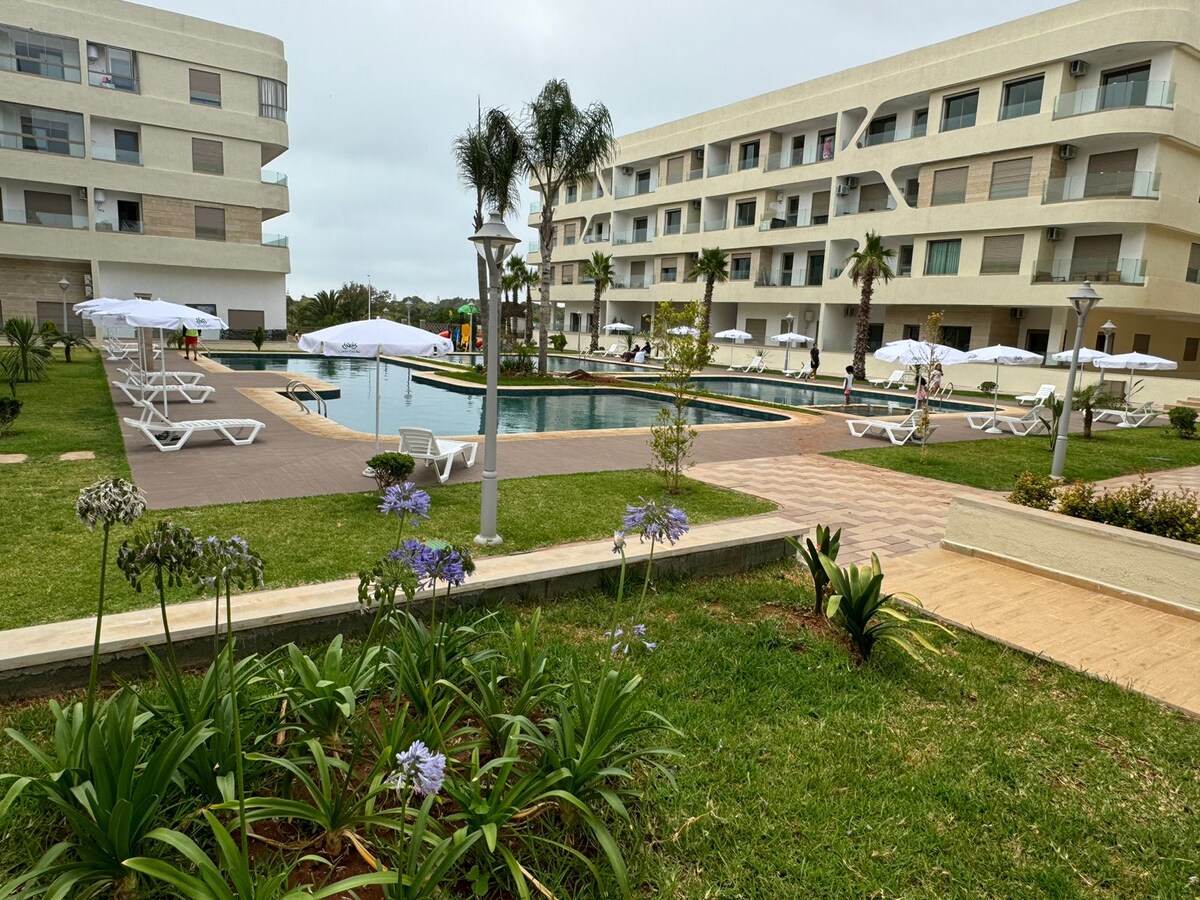 otkrijte starinski šarm ovog prelijepog novog apartmanskog studija,sa savremenim dizajnom sa svim sadržajima,netflix, fiberoptic, klima uređaj, opremljenu kuhinju,u sigurnoj rezidenciji sa bazenom,dječjim klubom, 800m od plaže, 100m od parka i njegovih restorana,kafića,barova i supermarketa. željeznička stanica 15mn hoda.rabat 45mn i Kazablanka 20mn vozom ili kar.busom do centra Kazablanke 10mn hoda. Može se staviti na raspolaganje dodatni prevoz od/do aerodroma.