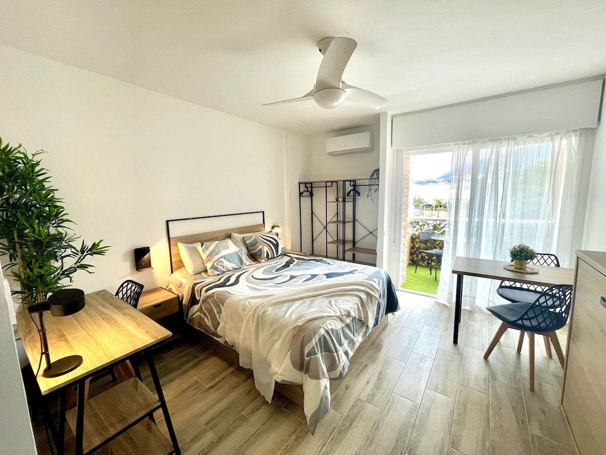 Estudio con terraza y vistas al mar frente a la playa. Cuenta con aire acondicionado, smart tv, netflix y punto de lectura. El complejo Benalbeach alberga gimnasio de pago, mini parque acuático con toboganes en las piscinas, supermercado, sala de juegos y snack bar disponible durante el verano. Durante el invierno se modifican las aperturas de las piscinas, pero jardines disponibles todo el año. - Prohibido fumar. - Mascotas no permitidas.