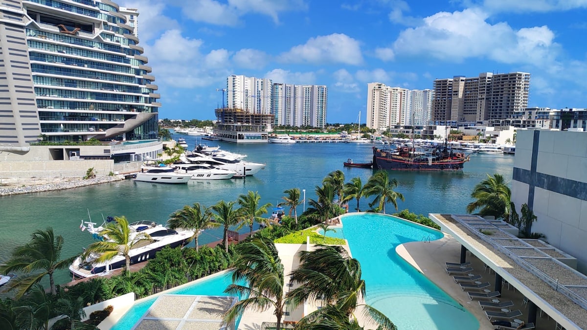 Beautiful Luxury apartment in Puerto Cancun, Hotel Zone, the most exclusive area of the city. Located with a beautiful view of the turquoise blue waters of the Caribbean Sea. Decorated in every detail, your stay will be very pleasant. It has all the necessary services, private parking, access with code and an enviable location! the condominium is connected to the Marina Puerto Cancun Shopping Center and you can walk down to find restaurants, shops, entertainment, etc.