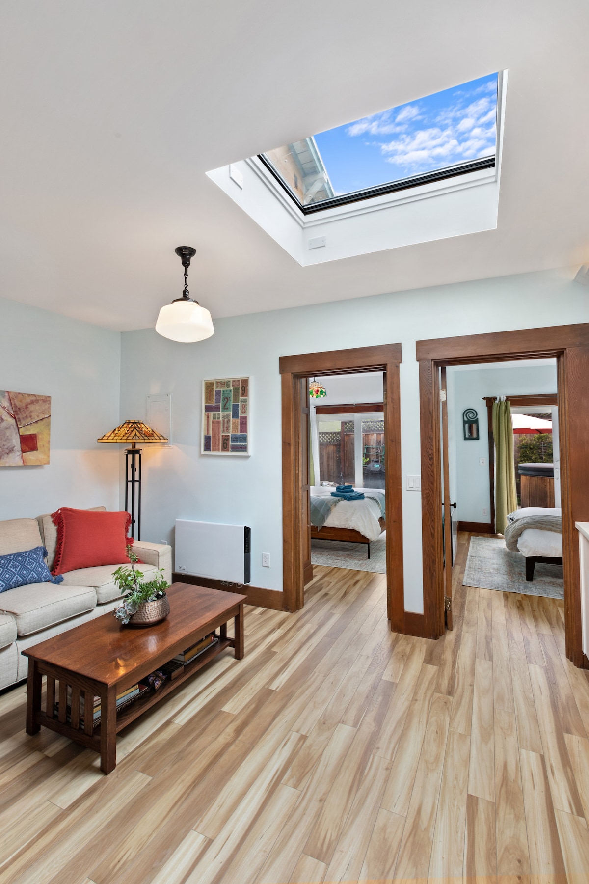 Ova prostrana, svijetla spavaća soba sa privatnim kupatilom nalazi se iza kuće i izlazi na zajedničku baštu. Spavajte na bračnom dušeku od memorijske pjene i uživajte u prirodnom svjetlu koje prodire kroz krovni prozor. Ovaj smještaj u centru grada je: * 3 minuta hoda do kafe, kafića i prodavnica * 8 minuta hoda do Berklija * 18 minuta hoda do centra Berkli BARTA * 20 minuta hoda do Grčkog pozorišta Za kretanje automobilom nije potreban, ali je parkiranje izvan ulice dostupno uz najavu rezervacije.