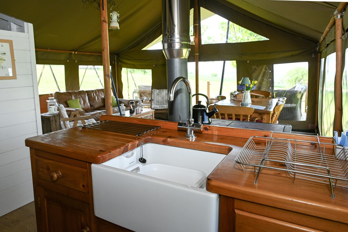 Ovo je nezaboravan odmor. *Vaš smještaj na platnu ima 5 luksuznih dušeka (posteljina je uključena) *Unutrašnji gorionik na drva i besplatno drvo. *Vaša privatna čajna kuhinja na otvorenom i kameni kamin! Zajednički prostor, kuhinja sa trpezarijom. Vrući tuševi i prikolice za kompostiranje. PLUS baštenski spa, okrugla kuća, sauna i ronjenje! Sve što vam treba je obezbijeđeno, samo ponesite sebe, hranu i piće! Evelin's Garden, Oksfordšir