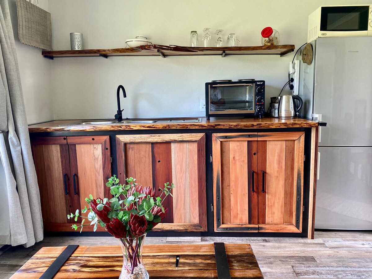 Come and enjoy some time away in this tranquil and secluded 2 bedroom stone chalet with thatch roof interior and private garden. The unit comprises of: - 2 bedrooms - a lounge and dining room with free wifi, Netflix & Openview - a fully equipped kitchenette. - private bathroom with a shower. Visitors can also enjoy the outside area which has beautiful views onto the small hill and a lovely braai/barbeque area. PLEASE NOTE: The unit does not have a back-up generator for load shedding.