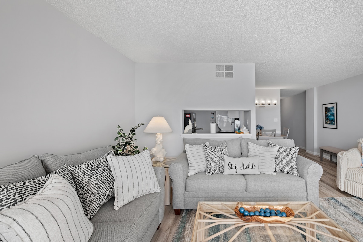 Koraci do plaže! Potpuno renoviran, svetao, moderan, čist stan sa pogledom na okean na balkonu. Mirna lokacija u severnom Oušn Sitiju sa pešačkom udaljenošću do restorana, autobusa, 7-11, terena za mini golf, bioskop, parkova itd. Potpuno novi uređaji i nameštaj. Besplatan Wi-Fi, bračni krevet, televizor od 60inča i 40inča. Izvucite kauč na razvlačenje, potpuno novo kupatilo. Mašina za pranje i sušenje u jedinici. Stanica za kafu Keurig, stanica za punjenje iPhone-a. Privatni balkon. Besplatan parking.