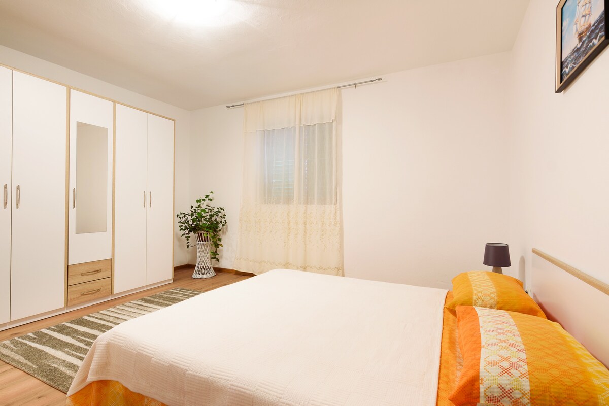 Prelep apartman Marina Bibinje. U mirnoj poziciji, 300 m od mora, 300 m od plaže, u slepoj ulici. Veliko privatno vlasništvo. U kući: perilica rublja, kuhinja, novo kupatilo. Parking u sklopu kuće. Prodavnica 300 m, restoran 1 km, šljunčana plaža, šljunčana plaža, kamenita plaža 300 m.