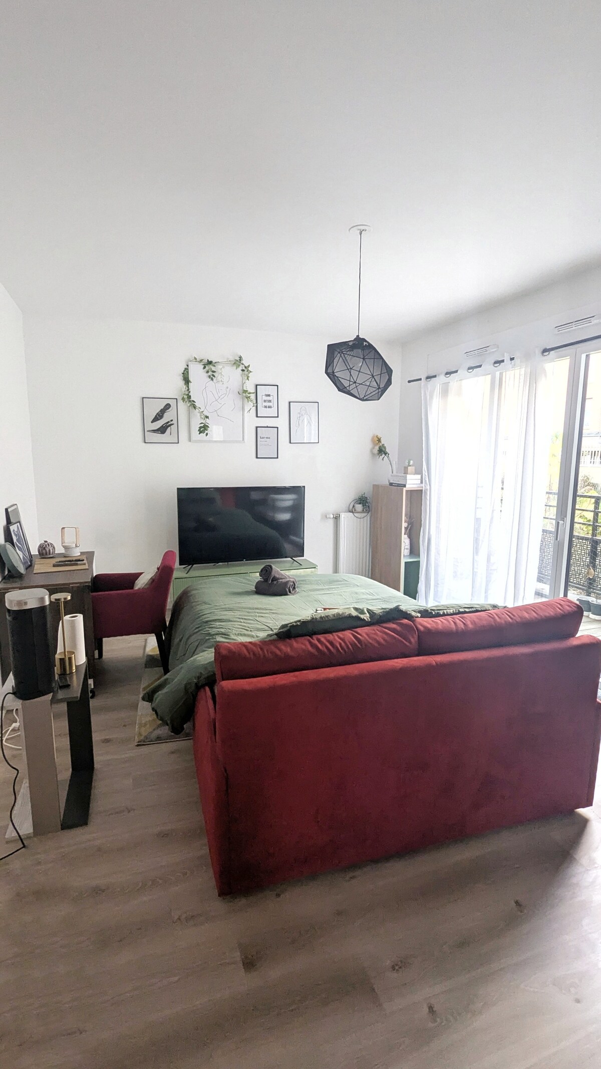 Smještaj «Žad» je čahura od 23m², tiha, mekana i šarena dekoracija, a nalazi se u četvrti u kojoj ćete se osjećati bezbjedno. Smještaj je potpuno nezavisan od kuće u kojoj živimo, a nalazi se 5 minuta hoda od stanice Houilles. Stan, sa visinom plafona od 2m10, sastoji se od tri sobe dobro proporcionalne : prostora za sjedenje i potpuno opremljene kuhinje u istoj jačini, spavaće sobe i kupatila.