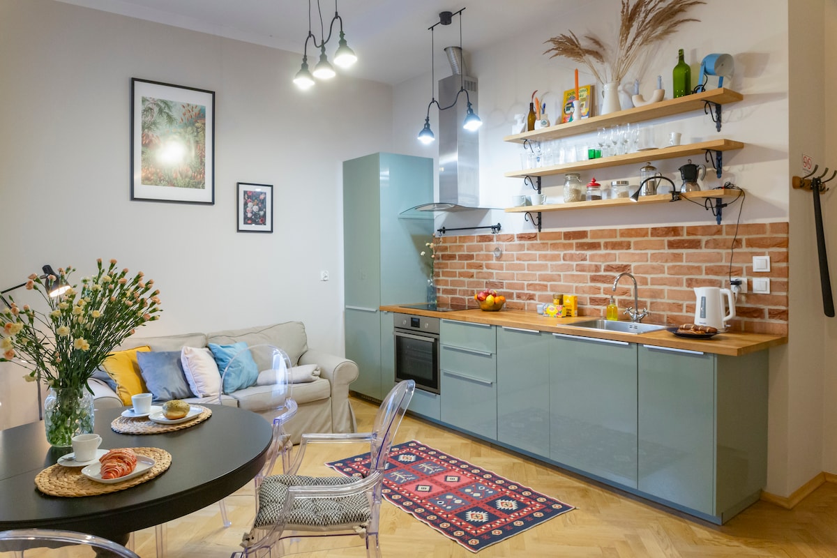 Autentičan, elegantan, prostran stan (55 m2) sa visokim plafonima (3,70 m), prelepo renoviran starinski nameštaj, udoban bračni krevet, posebno rađen kuhinjski nameštaj sa mermernom radnom pločom. Pravi stan, a ne hotel! Nalazi se u gradskoj kući iz 19. vijeka s pogledom u srcu Podgórzea. 1 spavaća soba, dnevna soba, besplatan VIFI, 40" flat-screen sat TV, mašina za pranje sudova, šporet, rerna, frižider, pegla, veš mašina, sušilica za kosu, fen za kosu. Pravi dom daleko od doma! Svideće vam se! Naši gosti to rade!