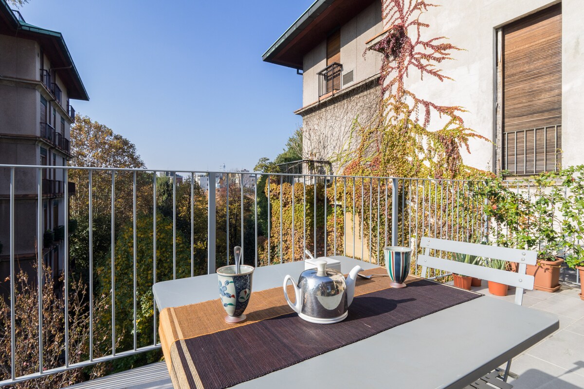 Penthaus okružen zelenilom s pogledom na Milano. Stan se nalazi na osmom i posljednjem spratu i sastoji se od otvorenog prostora sa kuhinjom i dvostrukim kaučem na razvlačenje (sa dva nadmadraca kako bi se osigurao najbolji mogući odmor), spavaće sobe sa bračnim krevetom i naslonjačem i kupatila. Stan ima spektakularan panoramski pogled na Duomo i centar grada, što se može ceniti sa kros-kantri prozora uz čašu vina.