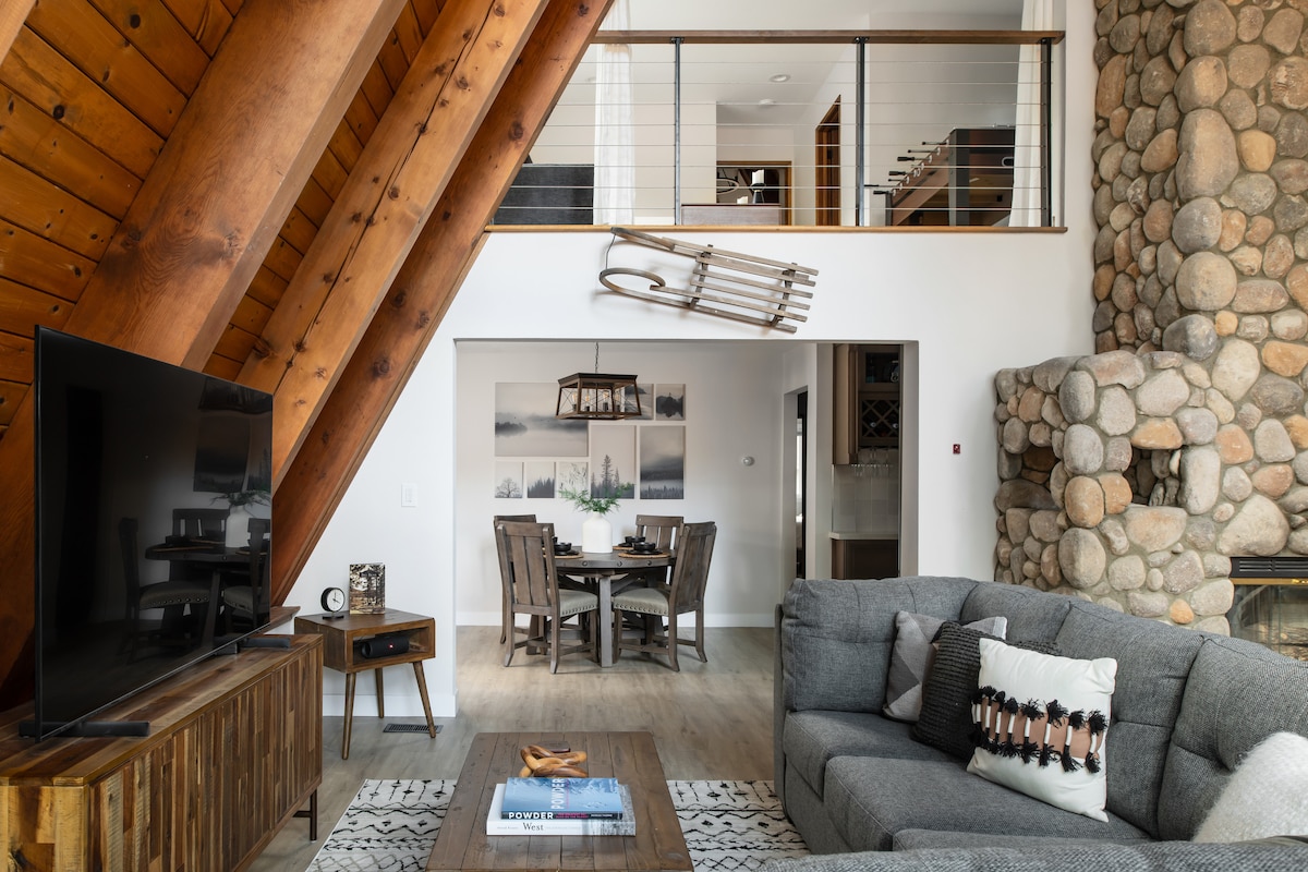 . Do odmarališta Big Bear Mountain stiže se peške . Zapanjujući zalasci sunca sa terase . Kućni ljubimci su dobrodošli . Potpuno opremljena kuhinja sa vrhunskim smeg + Hallman aparatima . A-Frame + Open Concept Lounge/Dining/Kitchen Velika nameštena glavna terasa sa prelepim pogledom na jezero i šumu . Bioskop sa projektorom visoke rezolucije . Roštilj . Planinarske staze ispred našeg praga . Brzi Wi-Fi + radni prostor . Centralno grejanje + kamini . Hidromasažna kada na natkrivenoj terasi koja nudi privatnost + živopisne poglede tokom cele godine!