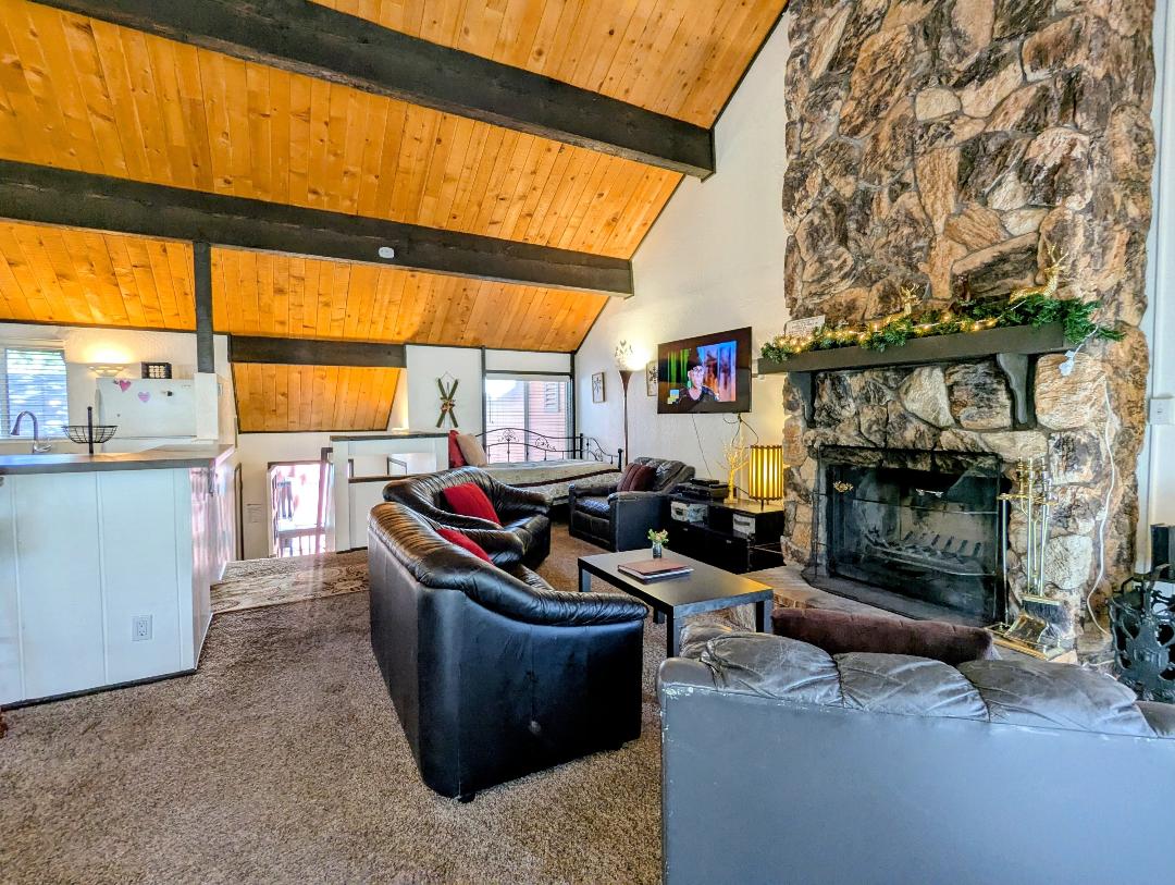 A true mountain cabin feel, steps away from beautiful Big Bear Lake! Enjoy the Lumberjack Lodge with its vaulted ceilings, red retro fridge, pool/jacuzzi, and balcony with beautiful lake and park views. Perfect for small families or couples looking for a spring or summer mountain retreat. Just 2 miles from The Village, 8 minutes to the slopes, and a 1 minute walk from Boulder Bay Park and the lake! VRR-2025-0842