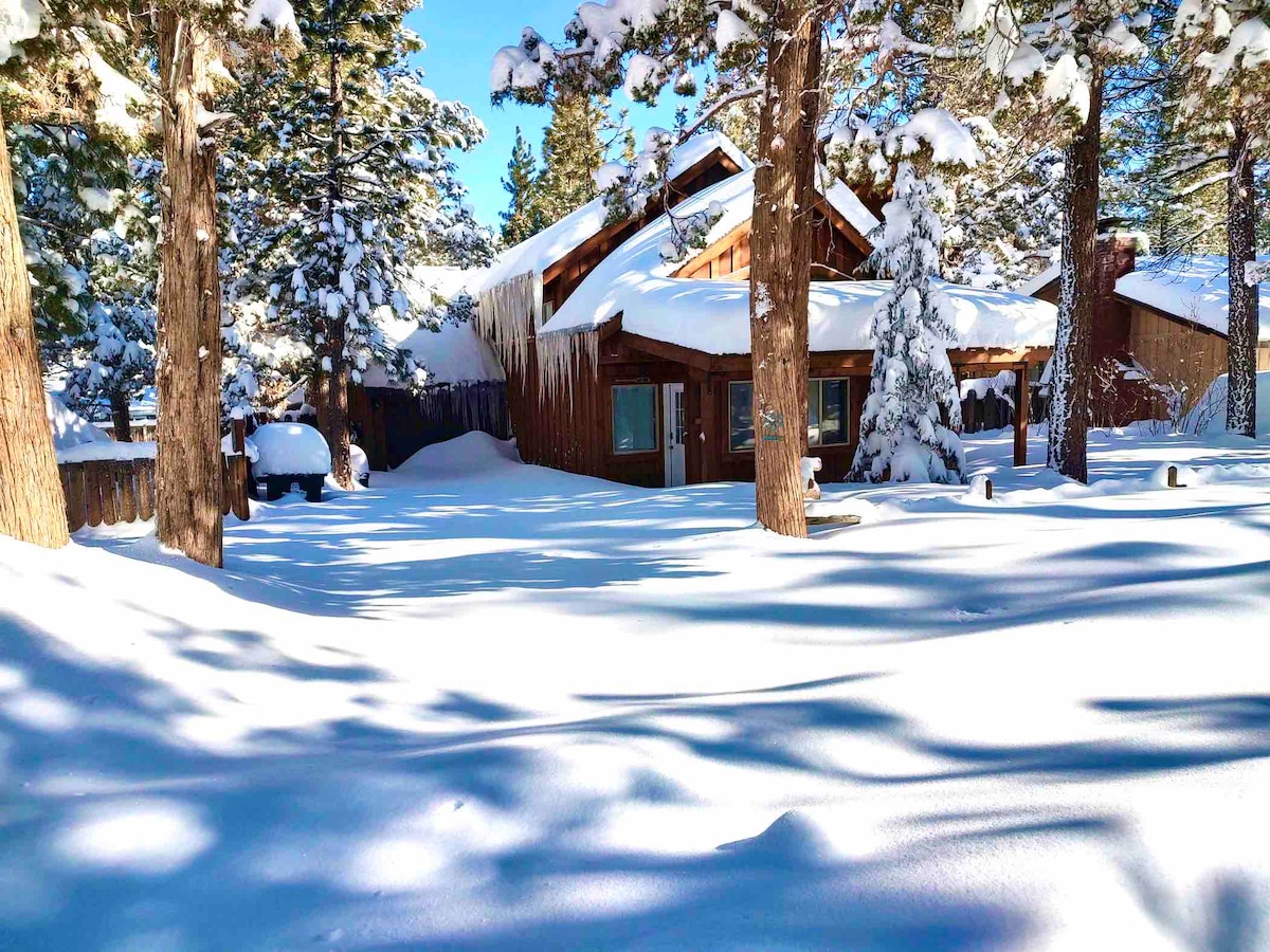 SAVE - GREAT SKI SEASON RATES Picture-Perfect Squeaky Clean Woodsy Cabin $0 Pet Fees Private 4-Person Spa Heated Garage Alpine-Modern 2-Bed 1-Bath Gas Fireplace White Shiplap Knotty Pine New KITCHEN, New APPLIANCES, New BATH Fire Pit on deck in A+ location. Great Tall-Pines Area. Easy Ski and Village access. Great Furnishings, Decor, Artwork, Comfy Beds, WiFi, Hulu TV, Gas Grill, Washer, Dryer PUP-FRIENDLY, FREE EV CHARGE. King in Primary; Queen in Guest. 21 tall pines on property. Rock garden.