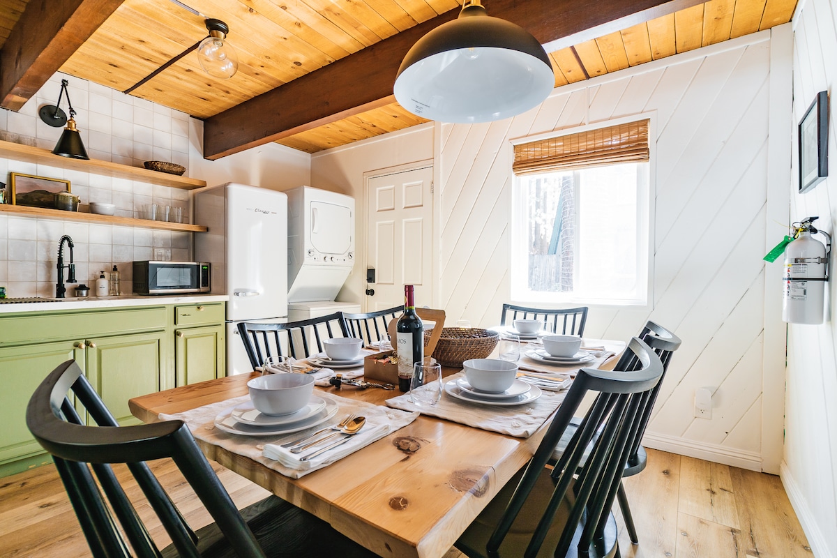 SAVE - GREAT OLYMPIC ROWING RATES Picture-Perfect $0 Pet Fees Squeaky Clean Woodsy Alpine Modern AC Cabin 4-Person Spa Garage 2-Bed 1-Bath Fireplace White Shiplap Knotty Pine New KITCHEN New APPLIANCES New BATH Fire Pit On Deck Great Neighborhood -- Close In Location Easy Village and Lake Access Great Furnishings, Decor, Artwork, Comfy Beds, WiFi, Hulu TV, Gas Grill, Washer, Dryer PUP-FRIENDLY, FREE EV CHARGE. King in Primary; Queen in Guest. 21 tall pines on property. Night landscape lighting.