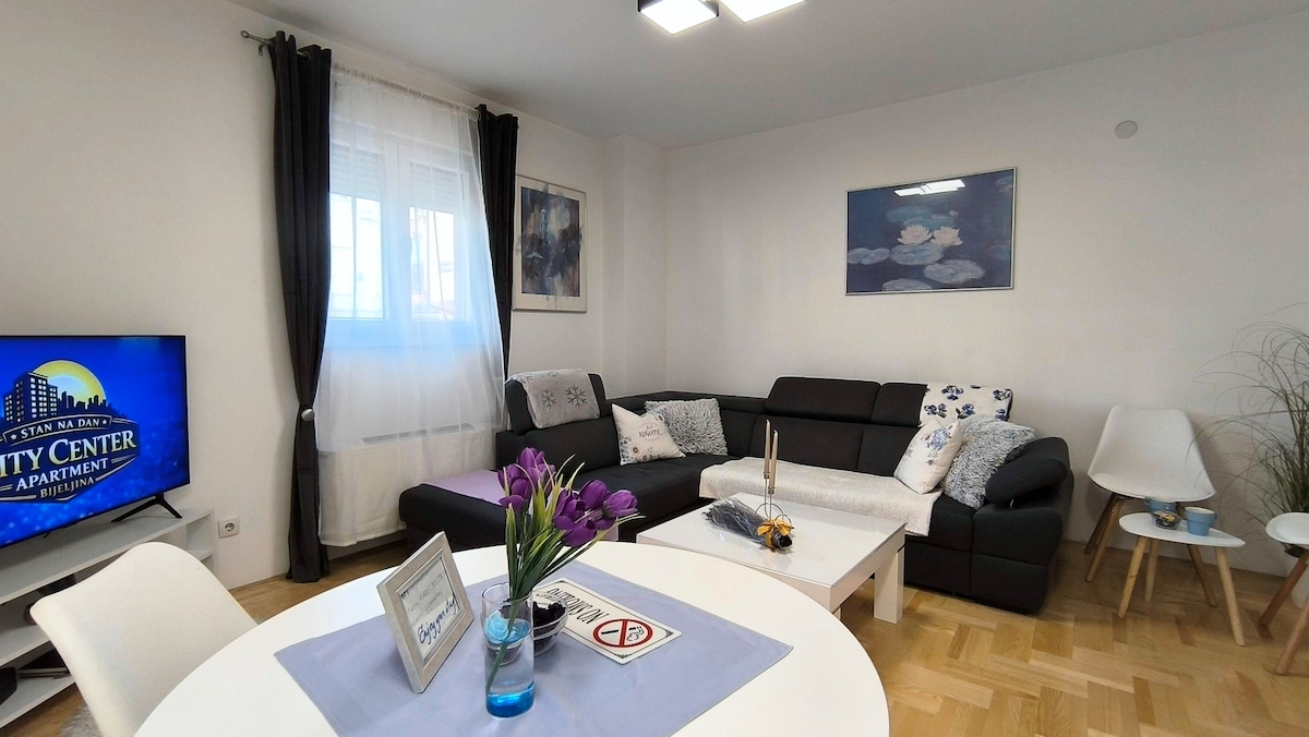 This newly furnished apartment is in the heart of the city at Meše Selimovića Street 18/9, on the second floor. City Hall is 100 meters away, and the bus station 20 meters. Nearby are banks, markets, cafés, and pharmacies. The apartment offers free parking, air conditioning, Wi-Fi and TV, fully equipped kitchen, clean linens and towels, washing machine, dryer, iron, and hairdryer. It has one bedroom with a double bed and a living room with a sofa bed for up to four guests. Welcome!