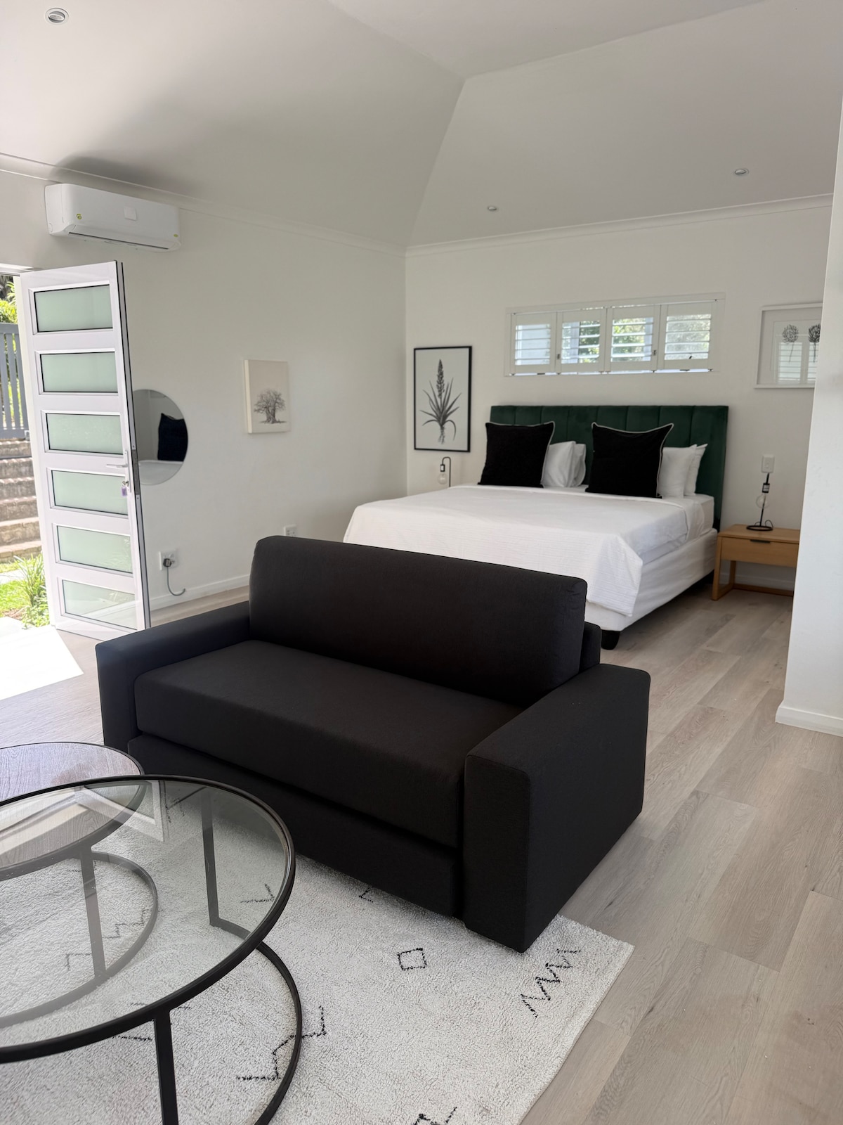 The Studio is a bright, stylish and cute self catering apartment with Wifi and Netflix TV situated in our garden with its own private deck and access to a pool and barbeque area. It sleeps two with an en suite shower and has a well equipped kitchenette and a comfortable conversation/reading area with two armchairs and a bistro table. There is a private deck with more seating for outdoor relaxing. Guests are allowed to use the owner’s pool for dips. A barbecue facility is also available.