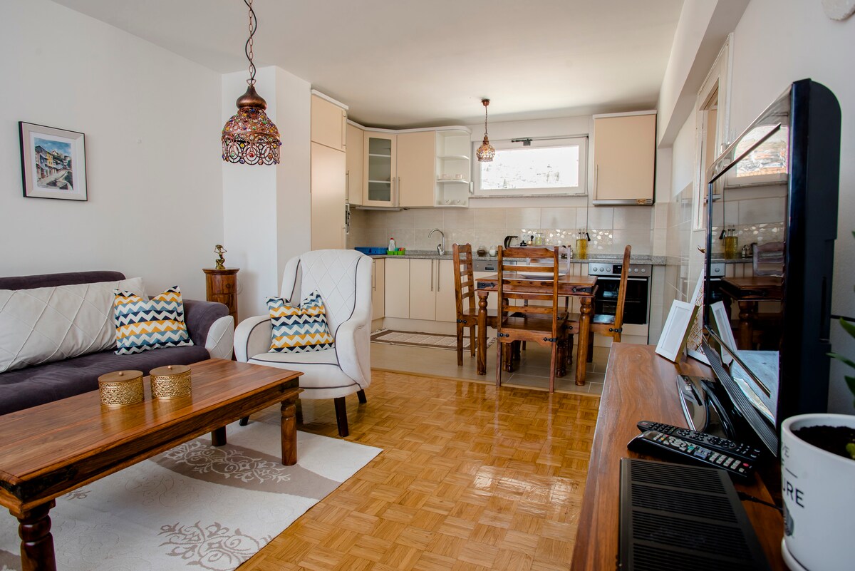 Modern, newly renovated apartment (45m2) in the heart of Mostar, just a few minutes’ walk from the Old Bridge. Set near the canyon of the Neretva River, it offers a relaxing atmosphere. The apartment includes a queen bed, private bathroom, kitchen, A/C, TV, free Wi-Fi, and private parking. Guests can enjoy stunning views from the peaceful garden behind the house, as shown in photos. In case this apartment is not available, you can check our other apartments.
