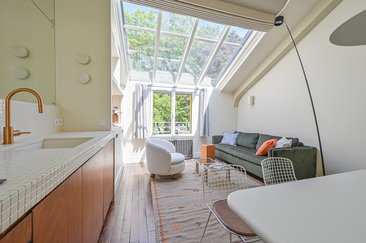 This exceptional space, located in Montmartre, was first a painter's studio before becoming a charming apartment. On one side, the living room offers a view of Amélie Poulain's grocery store. On the other side, the bedroom has a clear view, facing south. There are no flights of stairs to get to it. It is at the groundfloor.