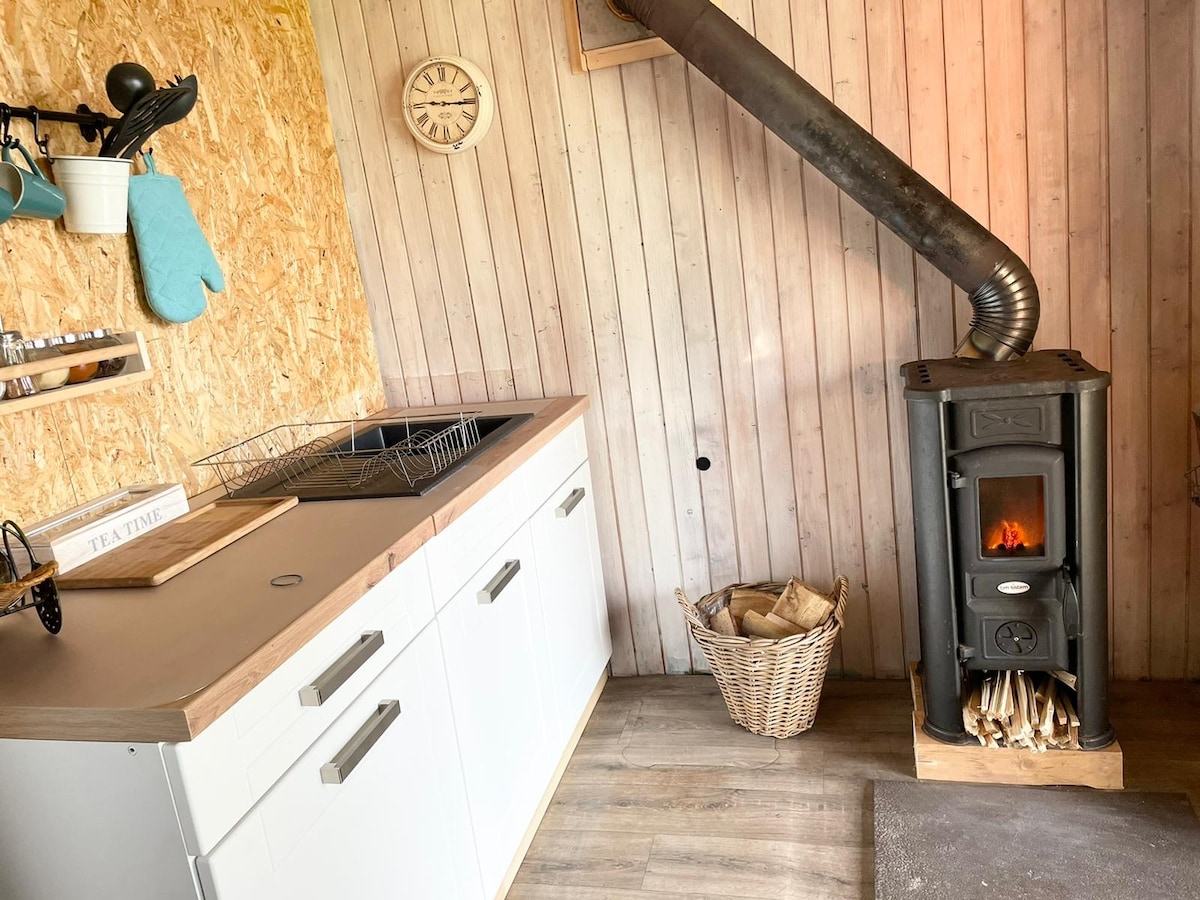 Naša drvena koliba se nalazi između dve reke. Tako da je ovo divno i veoma mirno mesto za boravak. Niz stepenice, postoji glavna soba, sa modernom kuhinjom, frižiderom, mašinom za veš, mašinom za pranje veša... postoji kamin, koji može da zagreje celu kabinu. Velika terasa je odlično mesto gde možete uživati u šolji čaja ili kafe. bašta i okruženje je zaista odlično mesto za decu. a ako vreme bude loše, možda će vas obradovati niski zamah u kabini... :-)