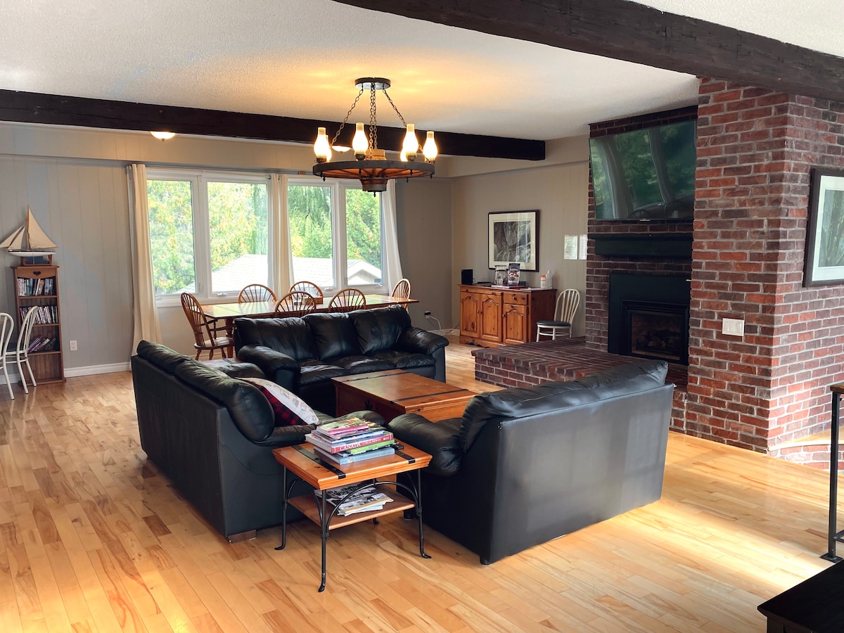 PROMOTION: book 2 nights get 1 free!* Follow us @cottagesatblue to qualify This large 2,400 sq ft 3 level, 6 bedroom, 2 bathroom Swiss-style chalet boasts wonderful views of Blue Mountain. Enjoy the view of Blue Mountain from the wrap-around deck or from behind the wall-to-wall windows, in the comfort of the living room with a real wood-burning fireplace. Enjoy all the conveniences of home! *Promo does not apply to holidays or long-weekends - please contact the hosts for further information
