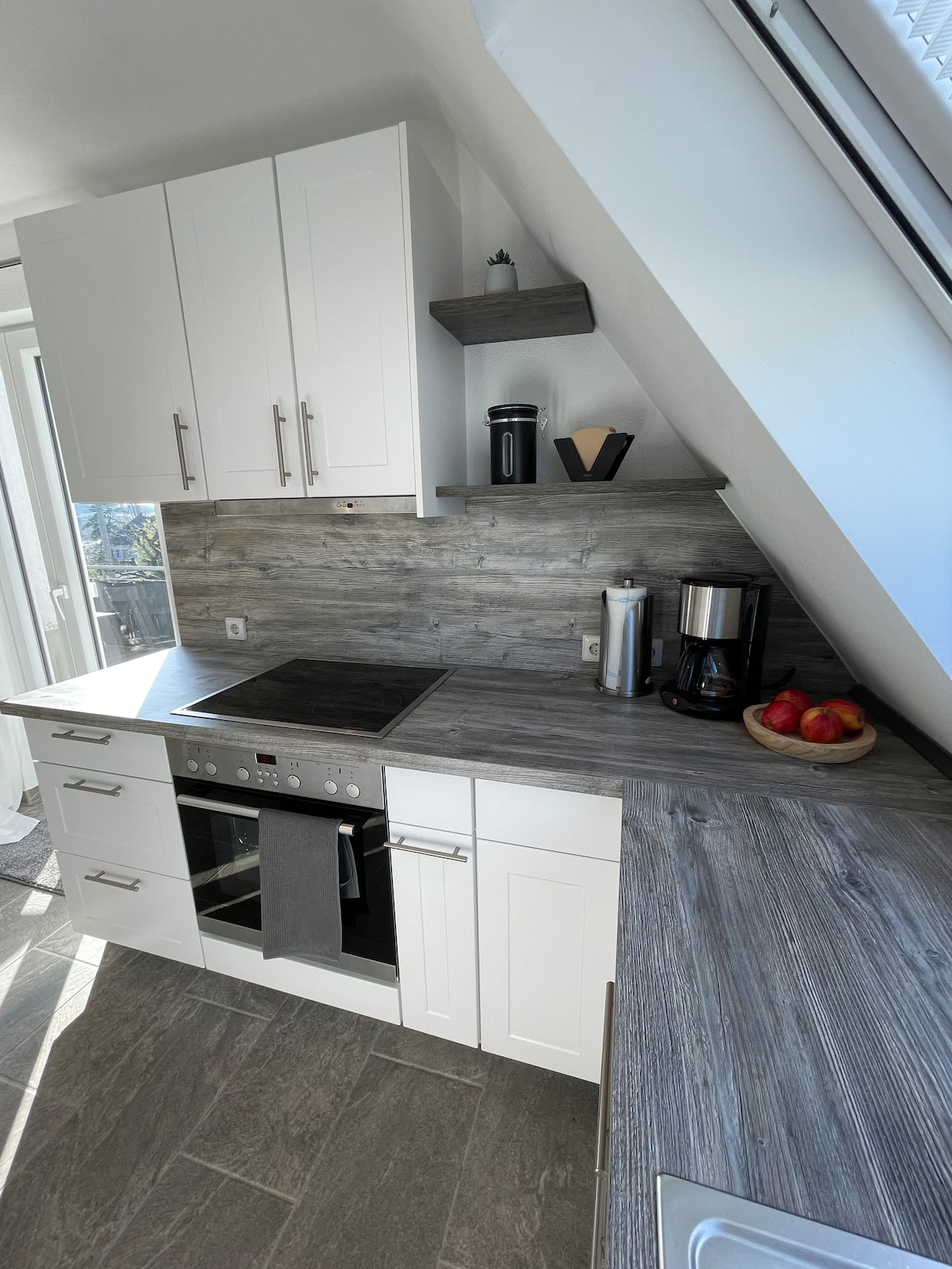 S ljubavlju renoviran stari stan. Krovni prozori propuštaju mnogo svjetla, a dekoracija je svijetla i šarena. Možete dobro da radite za stolom. Možete da se opustite u udobnoj fotelji. U komodi ima prostora za odlaganje vaših stvari. Na zahtjev vas čeka dječji krevet (Hauck putni krevetac dužine 120 cm). Kuhinja je prostrana i potpuno opremljena. Stan ima nagnute zidove sa 2 strane. To ga čini udobnim, ali možda preniskim za vrlo visoke goste.