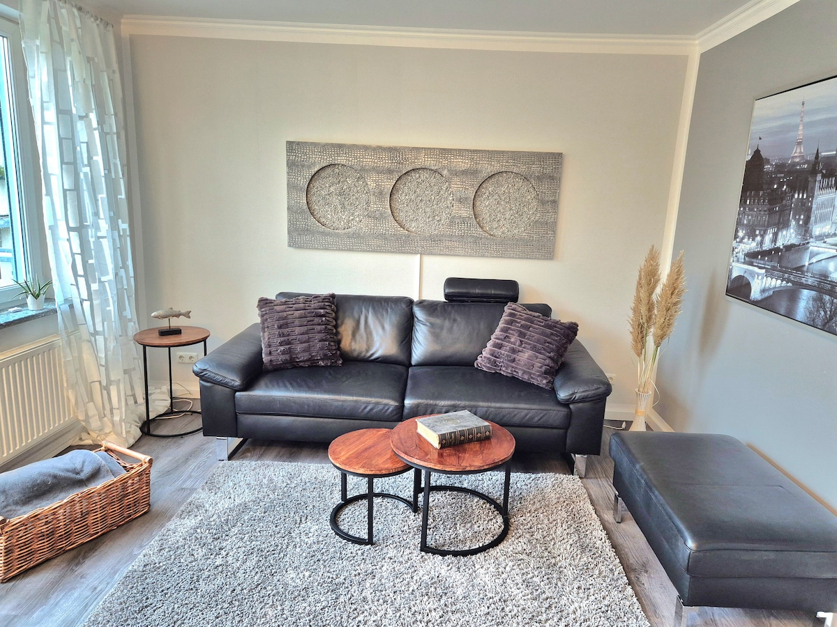 Moin! Nudimo naš susedni stan kao privatni smeštaj za iznajmljivanje. Ima sopstveni ulaz, kuhinju, tuš-kabinu i dnevni boravak/ spavaću sobu. Povezan je sa našom kućom unutrašnjim stepeništem. Na vrhu su vrata koja su zatvorena. Smeštaj ima zaseban ulaz, a mi vam dozvoljavamo primopredaju vremenskog fleksibilnog ključa. Peškiri, posteljina, Wi-Fi, čajnik, mašina za sudove, kamin i terasa su dostupni. Parking mesta su dostupna besplatno u sklopu smeštaja.