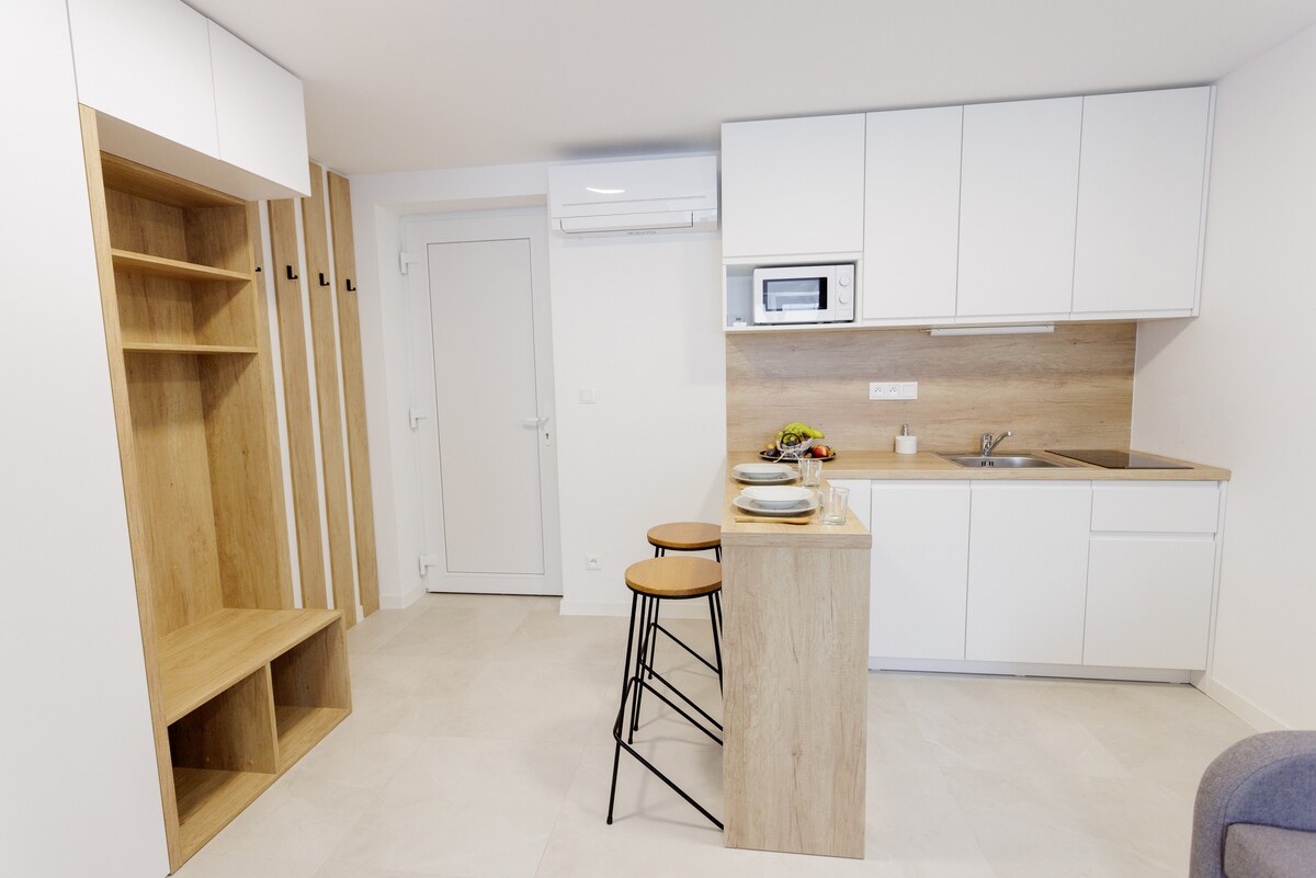 2-sobni apartman sa bračnim krevetom i 2 odvojena kreveta sa opcijom za 5. osobu sa krevetom na uvlačenje. Nedavno renovirana sa potpuno opremljenom kuhinjom i balkonom. Prostrani dnevni boravak. Brzi wi-fi i TV. Stan za nepušače. 2min hoda od autobuske stanice i prodavnice. Igralište za sve vrste ispod balkona.