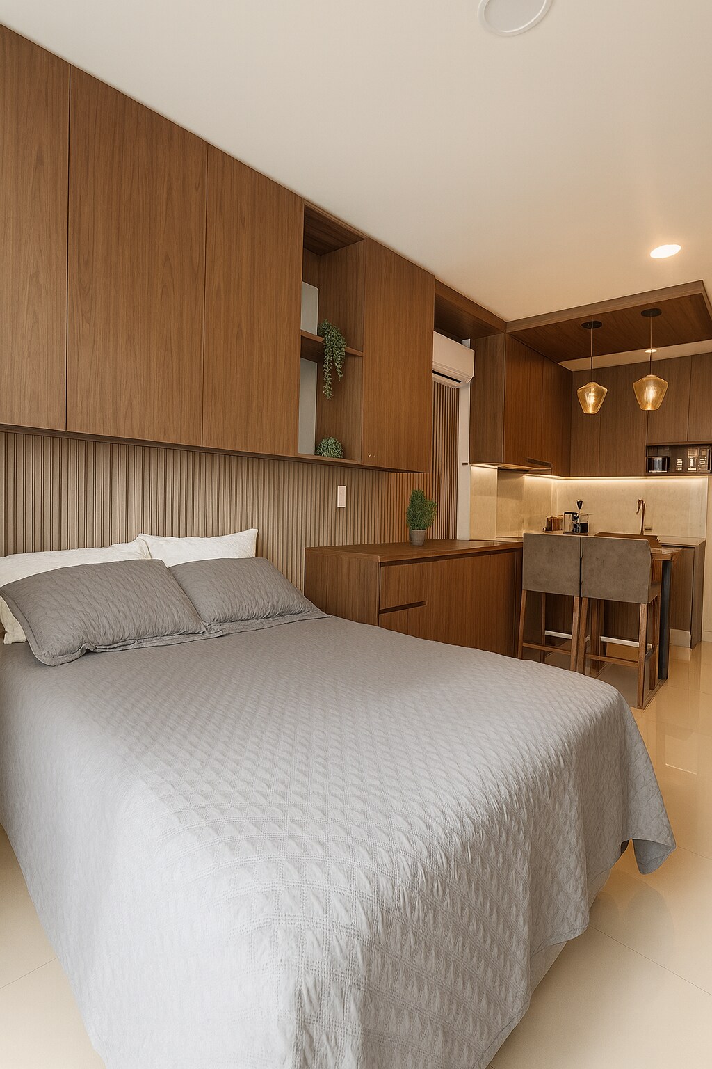 Tecnología, comodidad y un espacio ideal de trabajo en la mejor zona de Santa Cruz. En el departamento contarás con: - TV Smart - Aire acondicionado smart - Cortinas smart - Alexa - Cocina equipada - Ropero completo - Lavadora - Cama - Sofa cama Y en las áreas sociales: - Piscina y jacuzzi - Gimnasio - Sauna vapor y seco - Cine - Billar, futbolines y áreas de descanso - Área de trabajo con sala de reuniones - Churrasqueras con TV y frigobar Vive la experiencia y reserva ya!