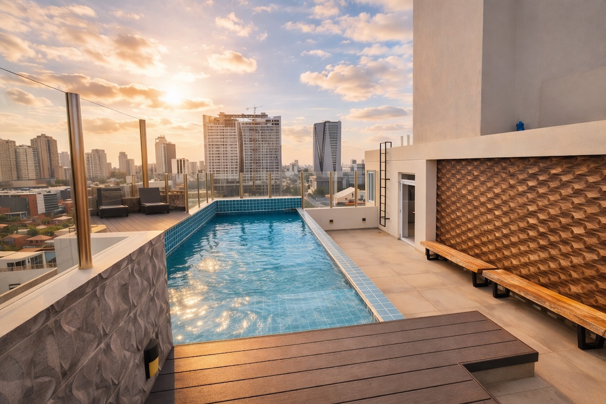 ¡Doživite POX! Predstavljamo naš najveći apartman u čuvenom zelenom tornju, najekskluzivnijoj i najluksuznijoj zgradi u Santa Kruzu. Potpuno opremljen apartman za jedinstveno iskustvo sa porodicom ili prijateljima. Dopustite da vas očara najbolji pogled na grad, pažnja 24/7 i blizina banaka, restorana, tržnih centara, sve što vam treba je na nekoliko metara. Pobrinućemo se da vam boravak bude sjajan, dobrodošli u POX!
