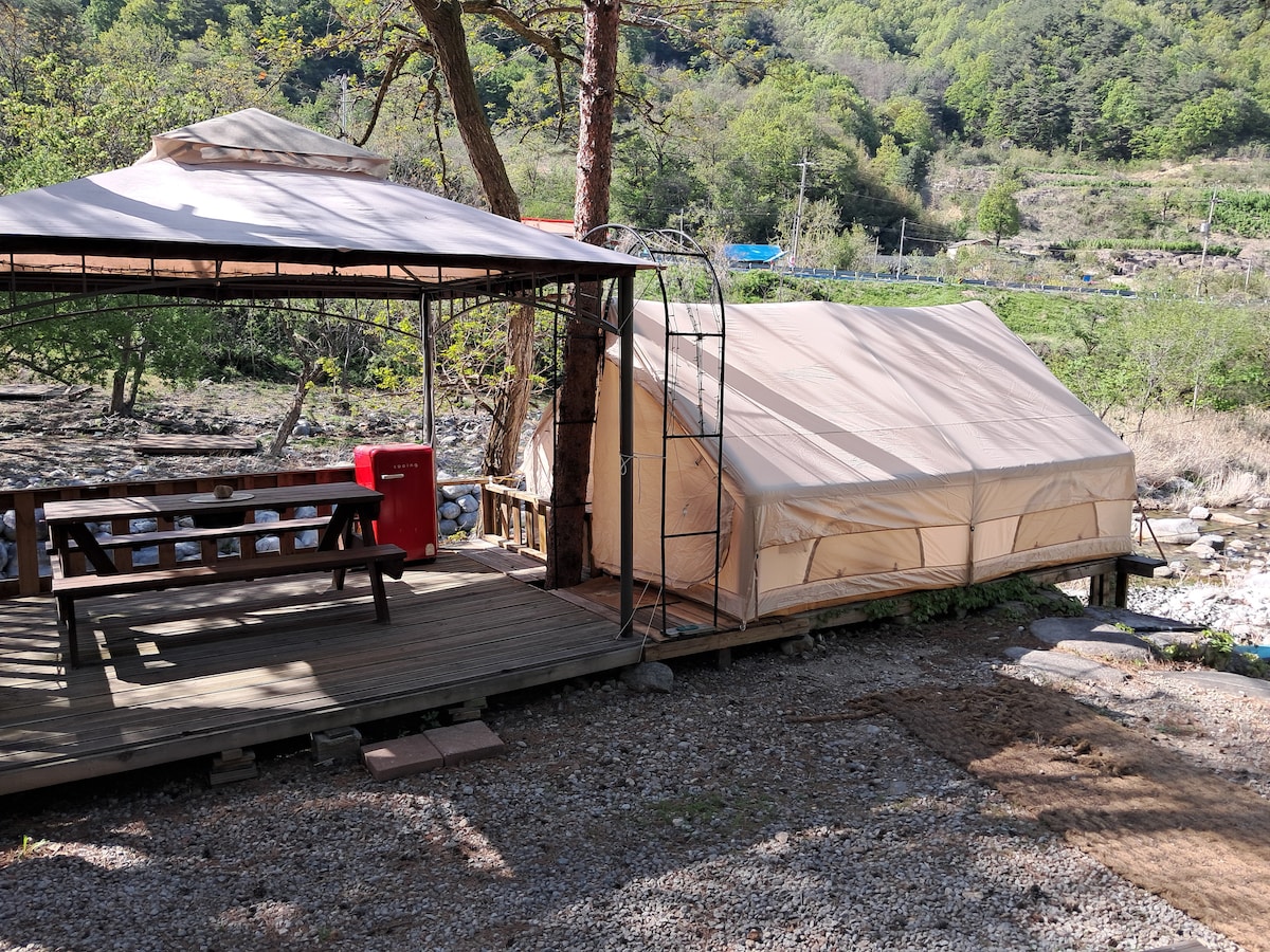 Kamp koji se nalazi na mirnom mjestu s pogledom na rijeku Pjongčang i most Pjongčang Tobogan bazen za✔ djecu, Bangbang Jjimjilbang, Hwangto Room for✔ Adults ✔ Kampovanje i pansion su dostupni u isto vrijeme Iscjeljenje ✔ u prirodi - rijeka Pjongčang, Čokdari-gil